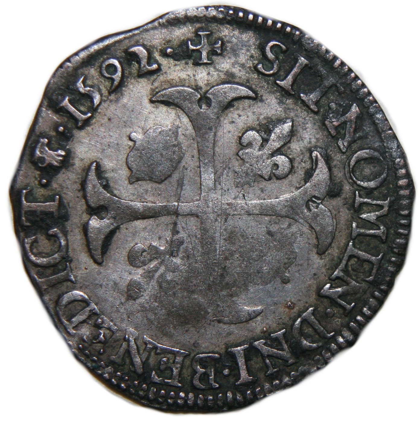 +SIT.NOMEN.DNI BENEDICT(dif) 1592. Béni soit le nom du Seigneur Croix échancrée, cantonnée de