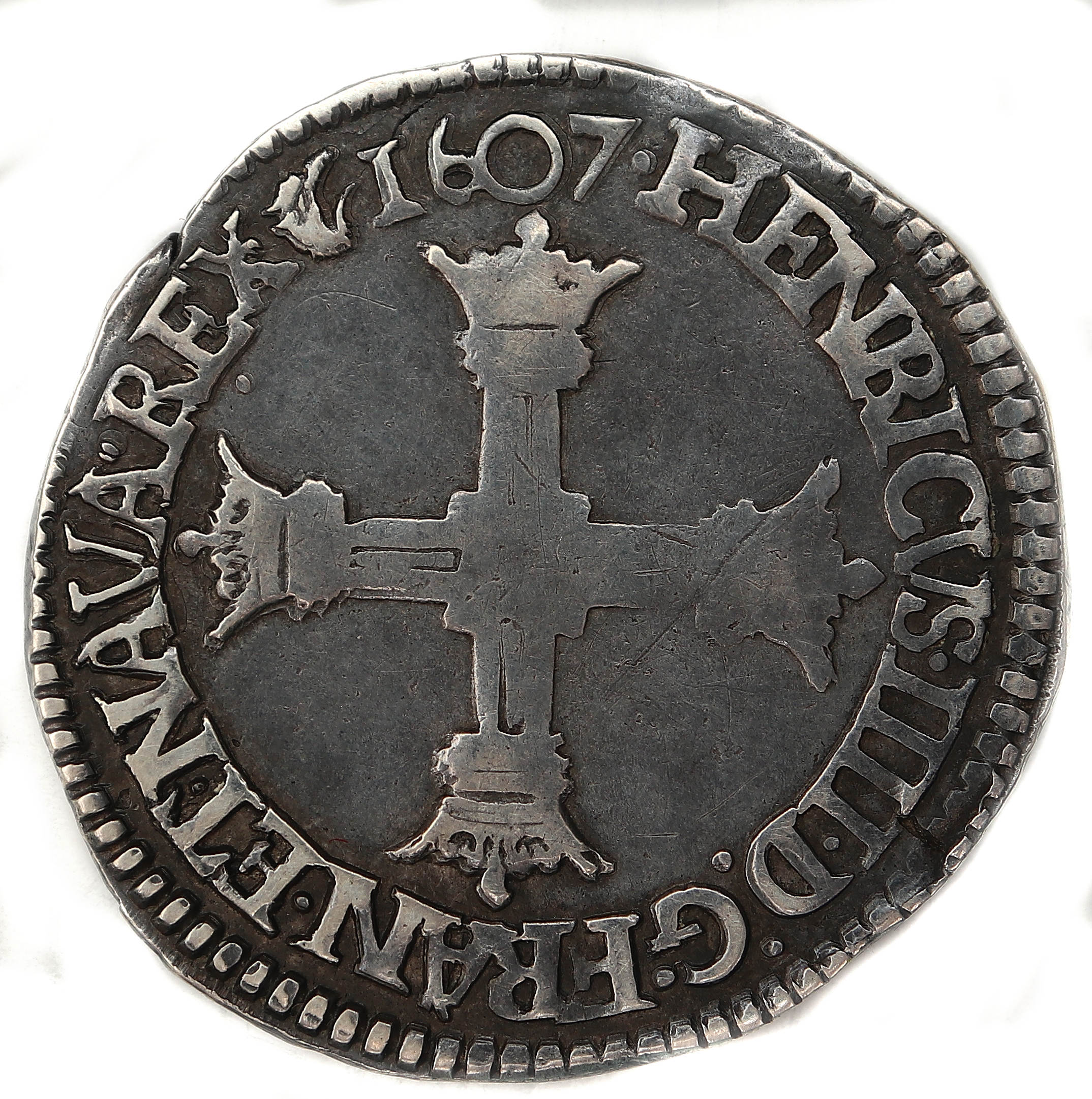 HENRICVS. IIII.D.G.FRAN.ET.NAVA.REX(dif).1607 Henri IIII par la grâce de Dieu roi de France et de Navarre. Croix formée de quatre bâtons couronnés |