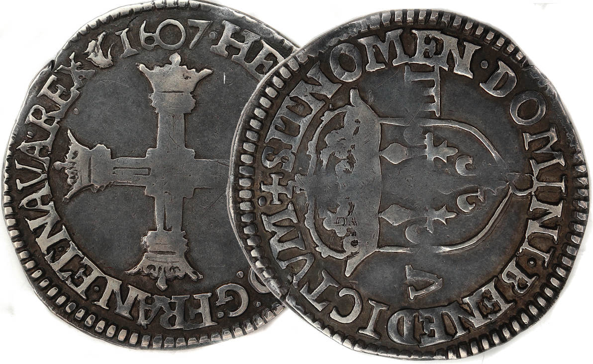 Lettre d'atelier : C (au revers sous l'écu) Point secret : Non Millésime : 1607 Chiffre de frappe connu : 80 514 ex (avec quarts d'écu) Indice de
