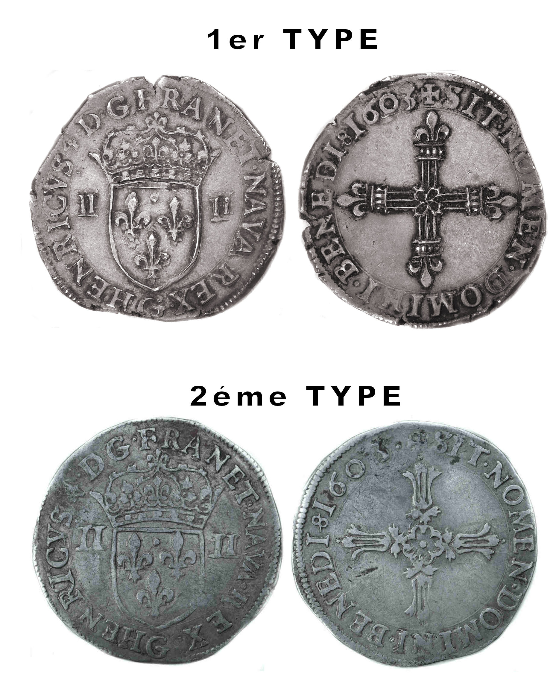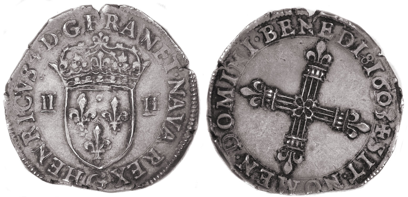 type (écu de face) furent frappés dans quelques ateliers de 1590 à 1607. A Poitiers les monnaies seront frappées suivant 2 types . Commentaire dans Franciae IV : "Dans la série des quarts et huitièmes d'écu de Henri III à Louis XIV, l'un des types présente un écu de France couronné et accosté de II et II ou V-III et une croix fleurdelisée avec un fleur cruciforme en coeur. Dans la grande majorité, la croix se présente au droit et l'écu ou revers mais dans un certain nombre d'atelier, on observe l'inverse : l'écu est au droit et la croix au revers" Pour l'atelier de Poitiers et le millésime 1603, il est noté "existence possible" pour le quart d'écu du 1er type, la même remarque est faite dans l'ouvrage de S. Sombart chez Gadoury en 2022. La monnaie confirme donc cette existence. Elle a fait partie de Monnaies 37 de la maison CGB en 2009 avec le commentaire suivant : "Monnaie de la plus grande rareté dont le type n’est pas signalé dans l’ouvrage de Jean Lafaurie et Pierre Prieur ou dans celui de Jean Duplessy. Monnaie qui manquait à la collection de quarts et huitièmes d’écu de M. Beynier." et la description suivante : "Ce quart d’écu est frappé sur un flan irrégulier et assez large. Exemplaire légèrement tréflé au droit et recouvert d’une légère patine grise" Le flan irrégulier présente quelques échancrures.a monnaie est assez agréable avec la croix du revers quasi superbe . Axe des coins : 3h |
