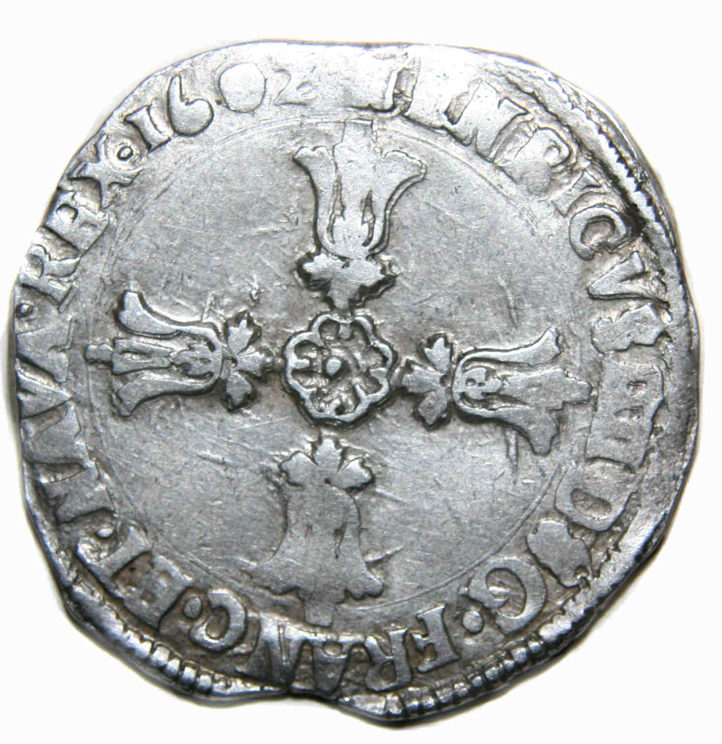 HENRICVS. IIII.D(dif)G.FRANC.ET.NAVA.REX.1602 Henri IIII par la grâce de Dieu roi de France et de Navarre. Croix feuilluez avec un quadrilobe ponctué au coeur |