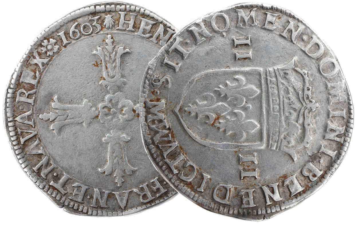 +HENRICVS. IIII.D.G.FRAN.ET.NAVA.REX. (dif)1603(dif) Henri IIIIpar la grâce de Dieu roi de France et de Navarre. Croix feuilluez avec un quadrilobe ponctué au coeur |