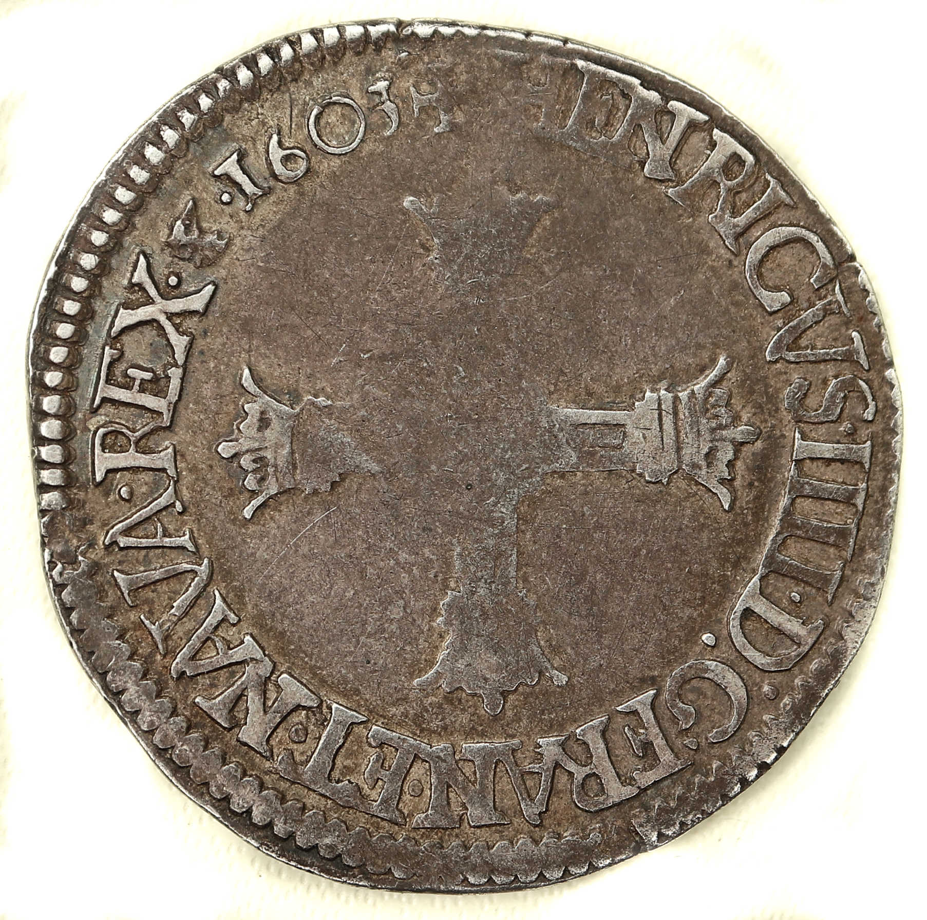 +HENRICVS. IIII.D.G.FRAN.ET.NAVA.REX(dif).1603 Henri IIII par la grâce de Dieu roi de France et de Navarre. Croix formée de quatre batons couronnés |