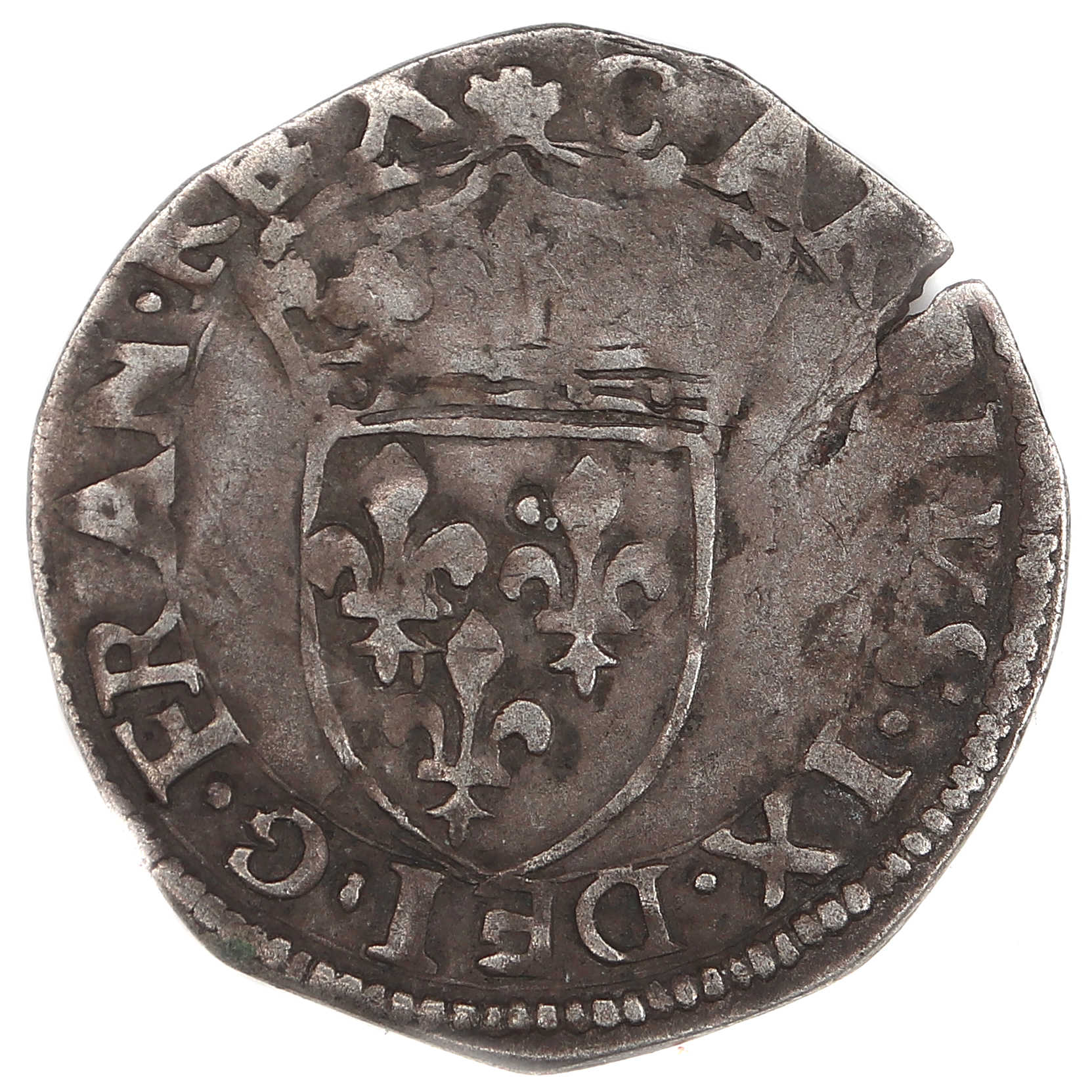 +CAROLVS.IX..DEI.G.FRAN.REX. Charles IX par la grâce de Dieu roi des Francs Ecu de France couronné.
