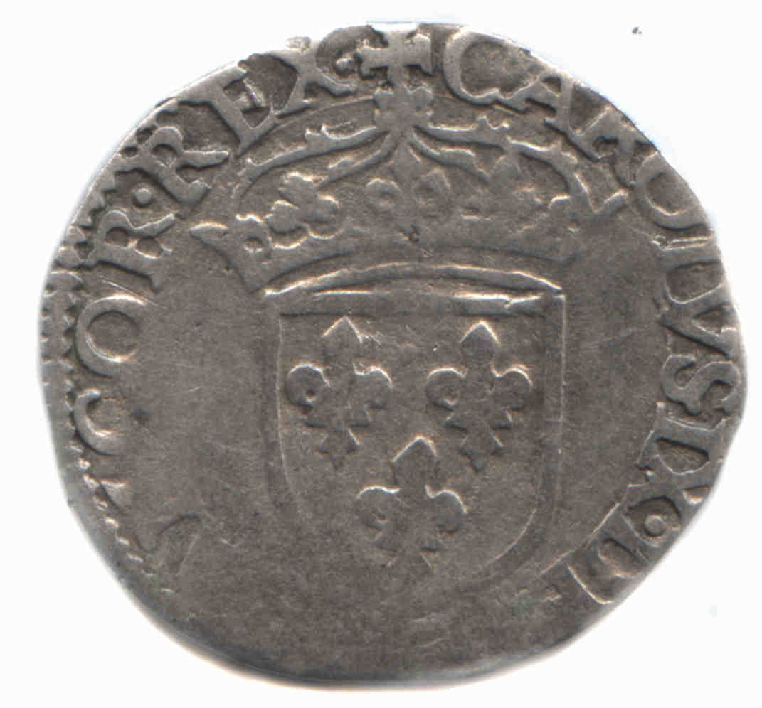 +CAROLVS.IX..DEI.G.FRANCOR.REX. Charles IX par la grâce de Dieu roi des Francs Ecu de France couronné.