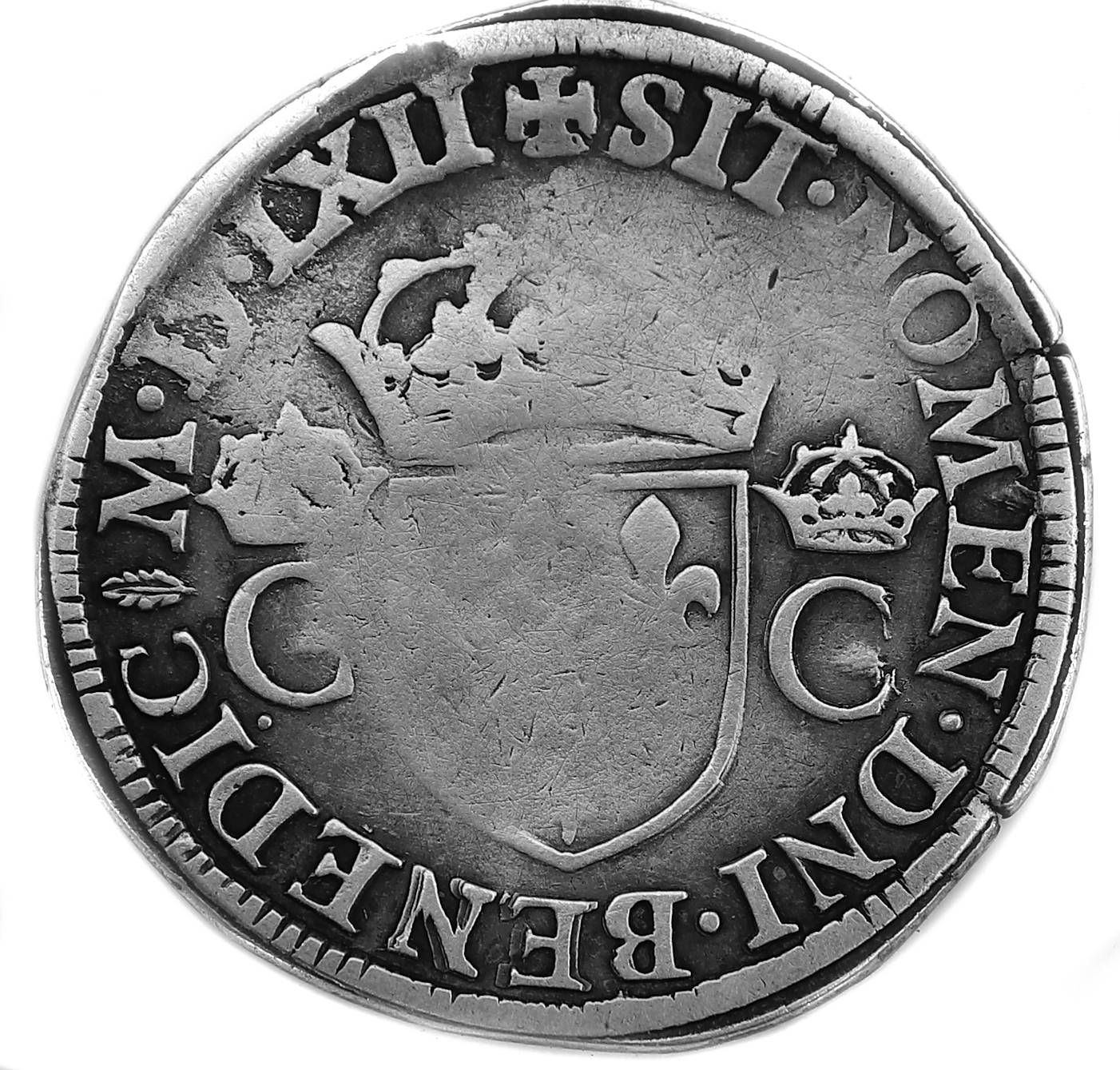 +.SIT.NOMEN.DNI.BENEDIC(dif).MDLXII Béni soit le nom du Seigneur Ecu de France couronné accosté