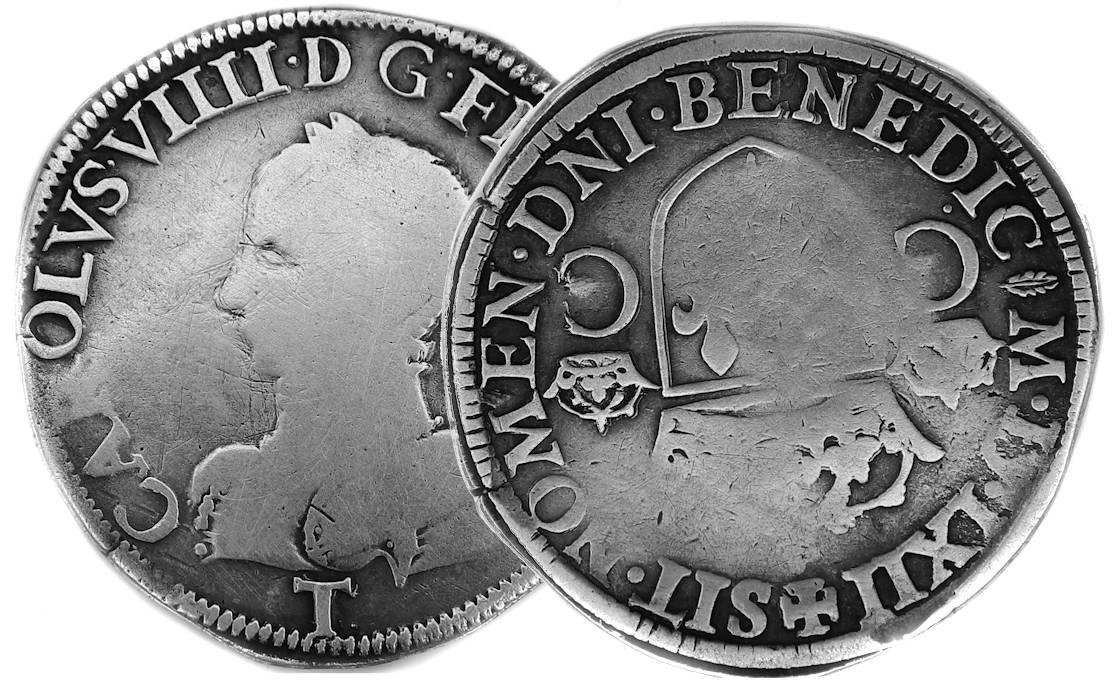 CAROLVS.VIIII.D.G.FRANC..REX T Charles VIIII par la grâce de Dieu roi des Francs Buste du roi, à droite, cuirassé