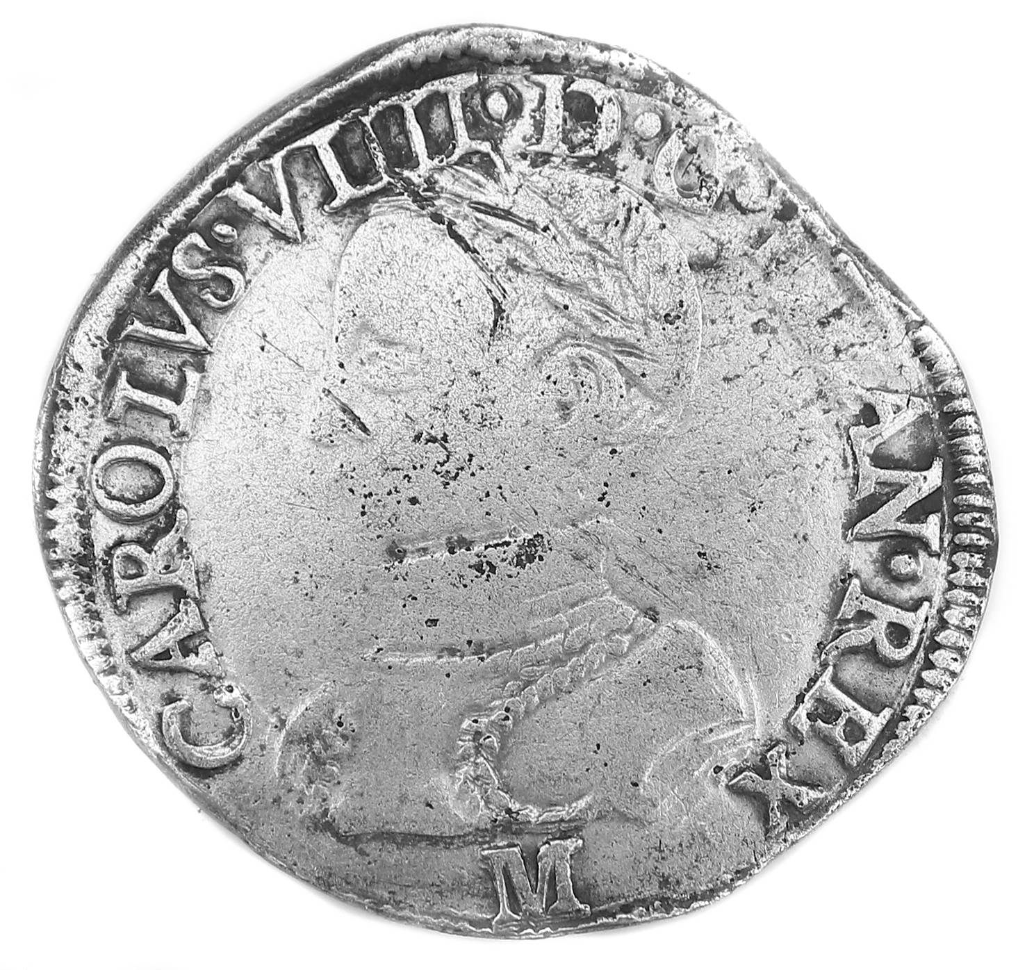 CAROLVS.VIII.D.G.FRAN.REX. M Charles VIIII par la grâce de Dieu roi des Francs Buste du roi, à droite, cuirassé