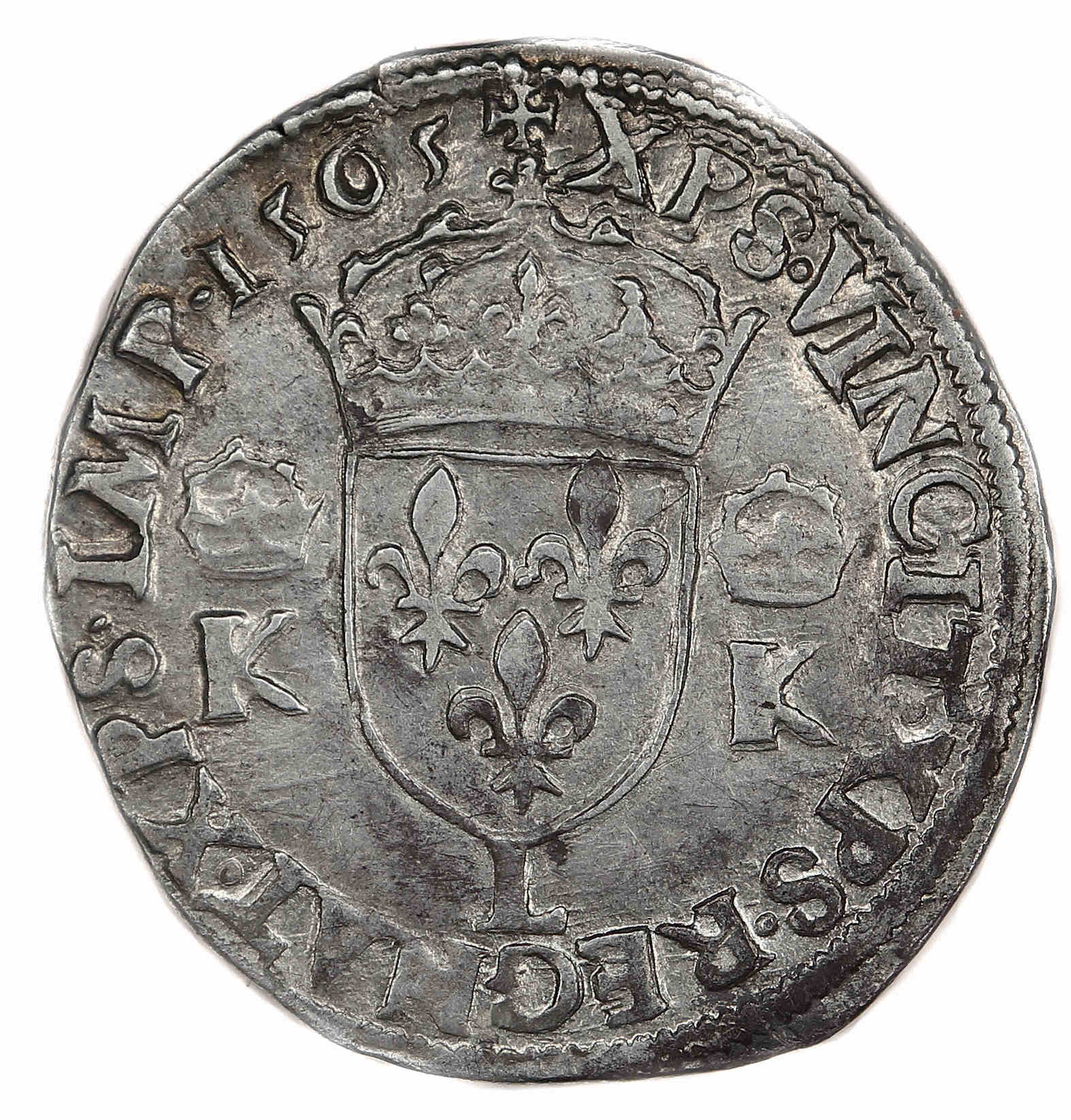Lettre d'atelier : L (au revers sous l'écu) Point secret : NON Millésime : 1565 Chiffre de frappe connu : 101 591 ex. (avec 1/2 testons) |
