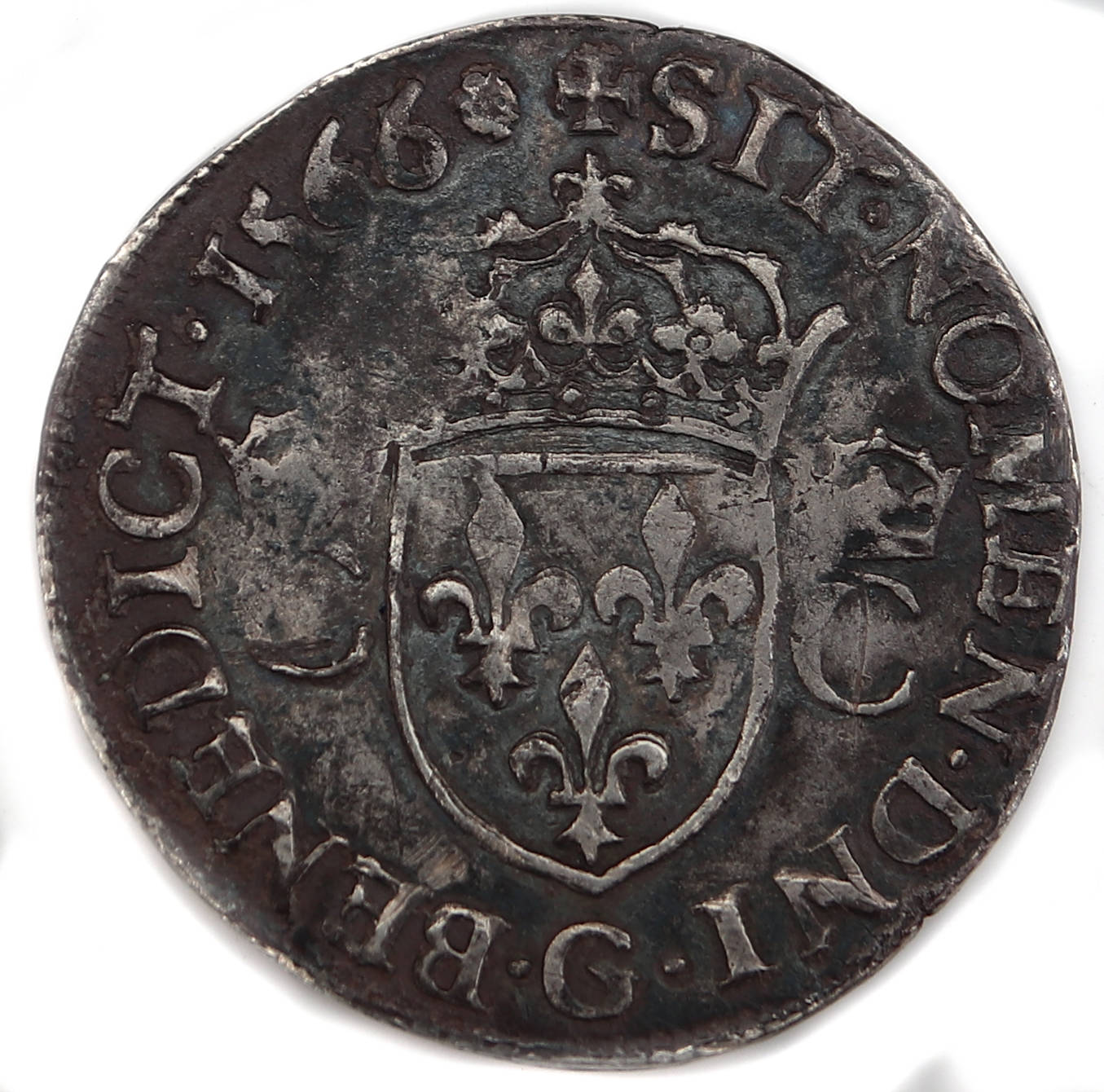 Lettre d'atelier : G (au revers sous l'écu) Point secret : 7éme (au droit ) Millésime : 1566 Chiffre de frappe connu : 14 739 ex. (avec 1/2 testons) |