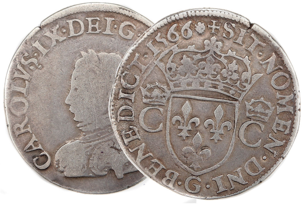 Lettre d'atelier : G (au revers sous l'écu) Point secret : 7éme (au droit ) Millésime : 1566 Chiffre de frappe connu : 14 739 ex. (avec 1/2 testons) |