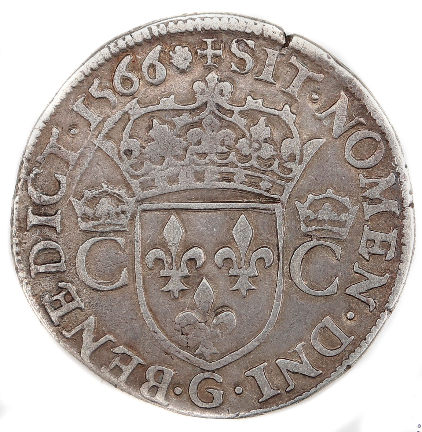 +.SIT.NOMEN.DNI.G.BENEDICT.1566 (dif) Béni soit le nom du Seigneur Ecu de France couronné accosté
