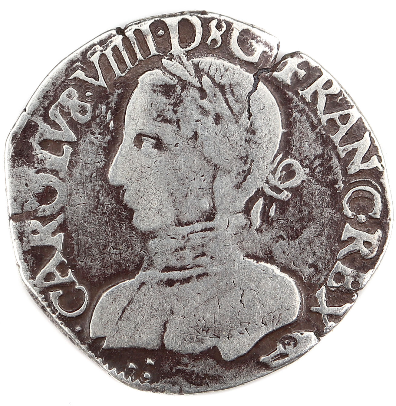 .CAROLVS.VIII.D(dif)G.FANC.REX(dif) trois . en triangle Charles VIIII par la grâce de Dieu roi des Francs Buste du roi, à droite, cuirassé et tête nue