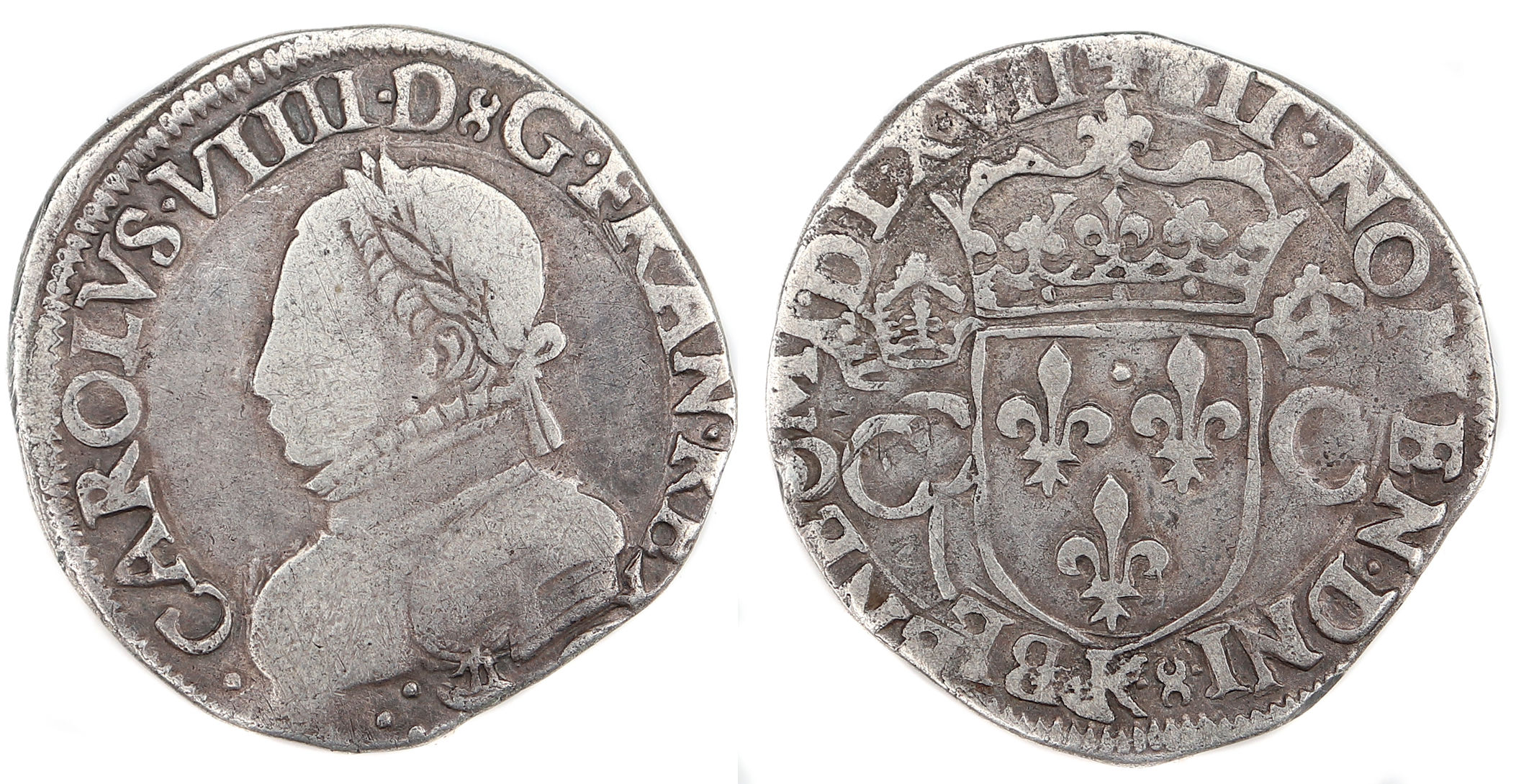 .CAROLVS.VIII.D.G.FANC.REX Charles VIIII par la grâce de Dieu roi des Francs Buste du roi, à droite, cuirassé