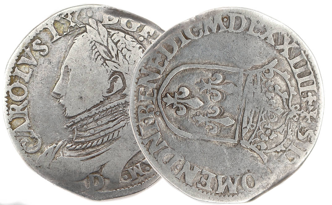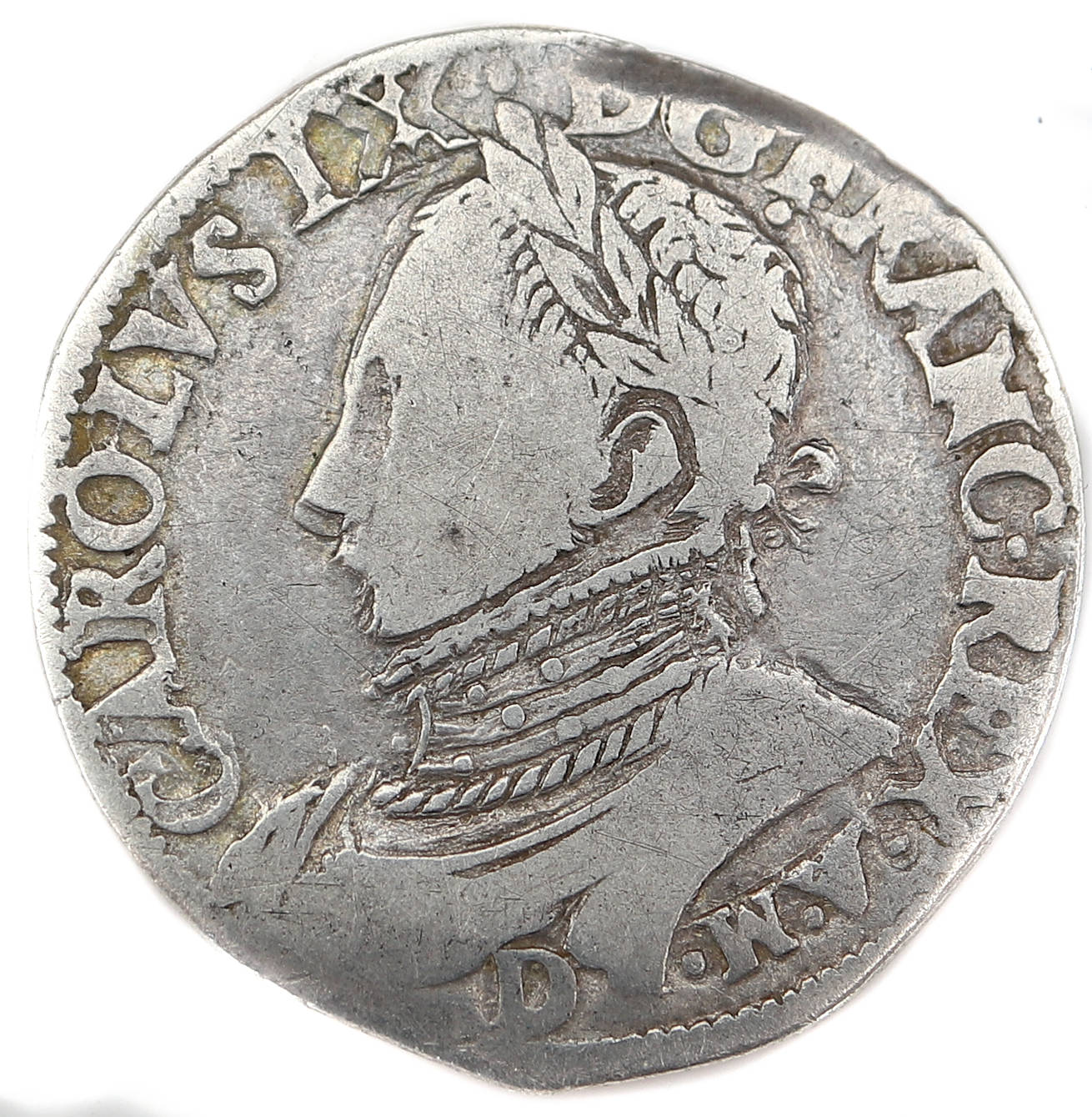 CAROLVS.IX.D.G.FRANC.REX.A.M. D Charles IX par la grâce de Dieu roi des Francs Buste du roi barbu à gauche,