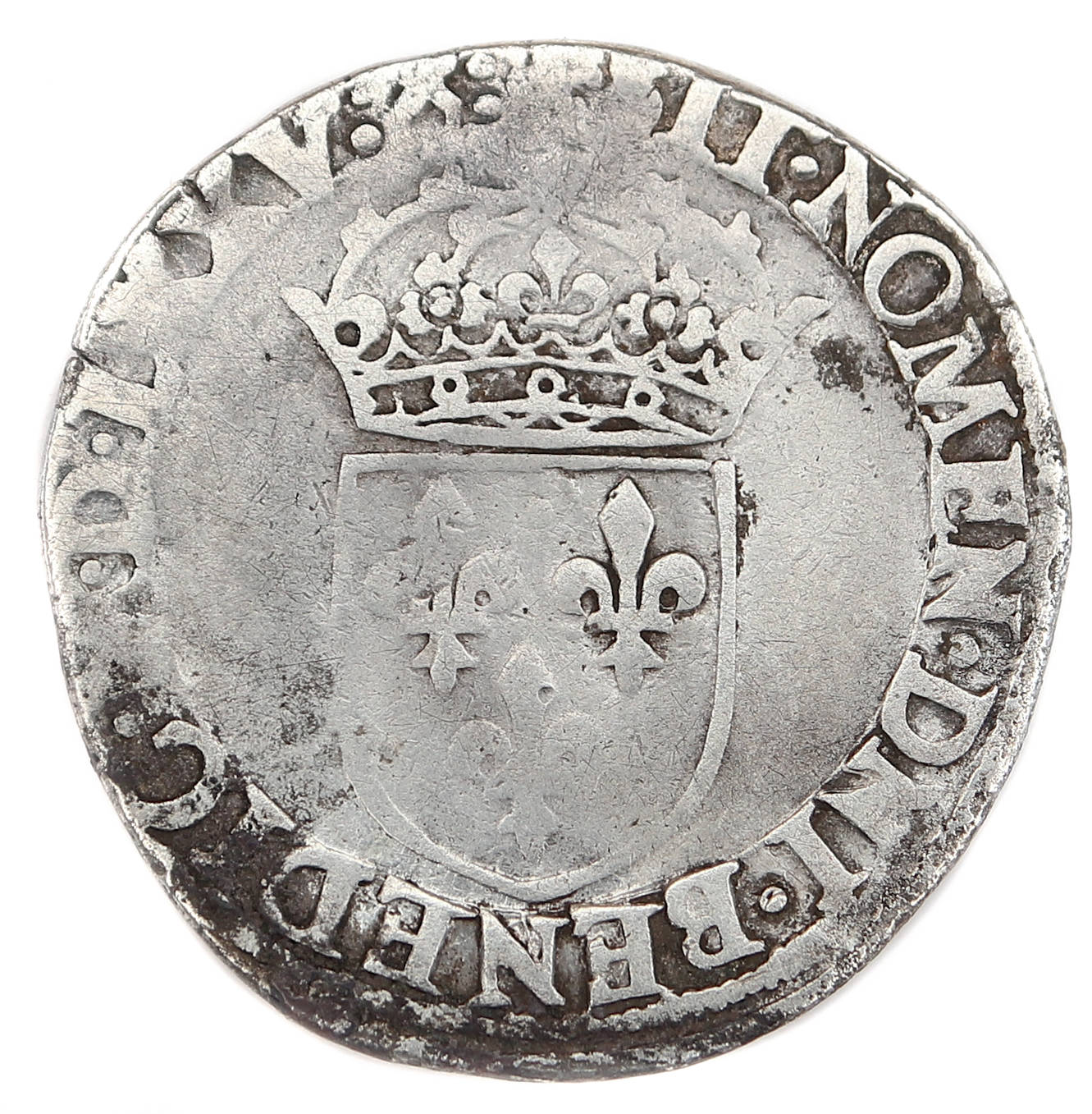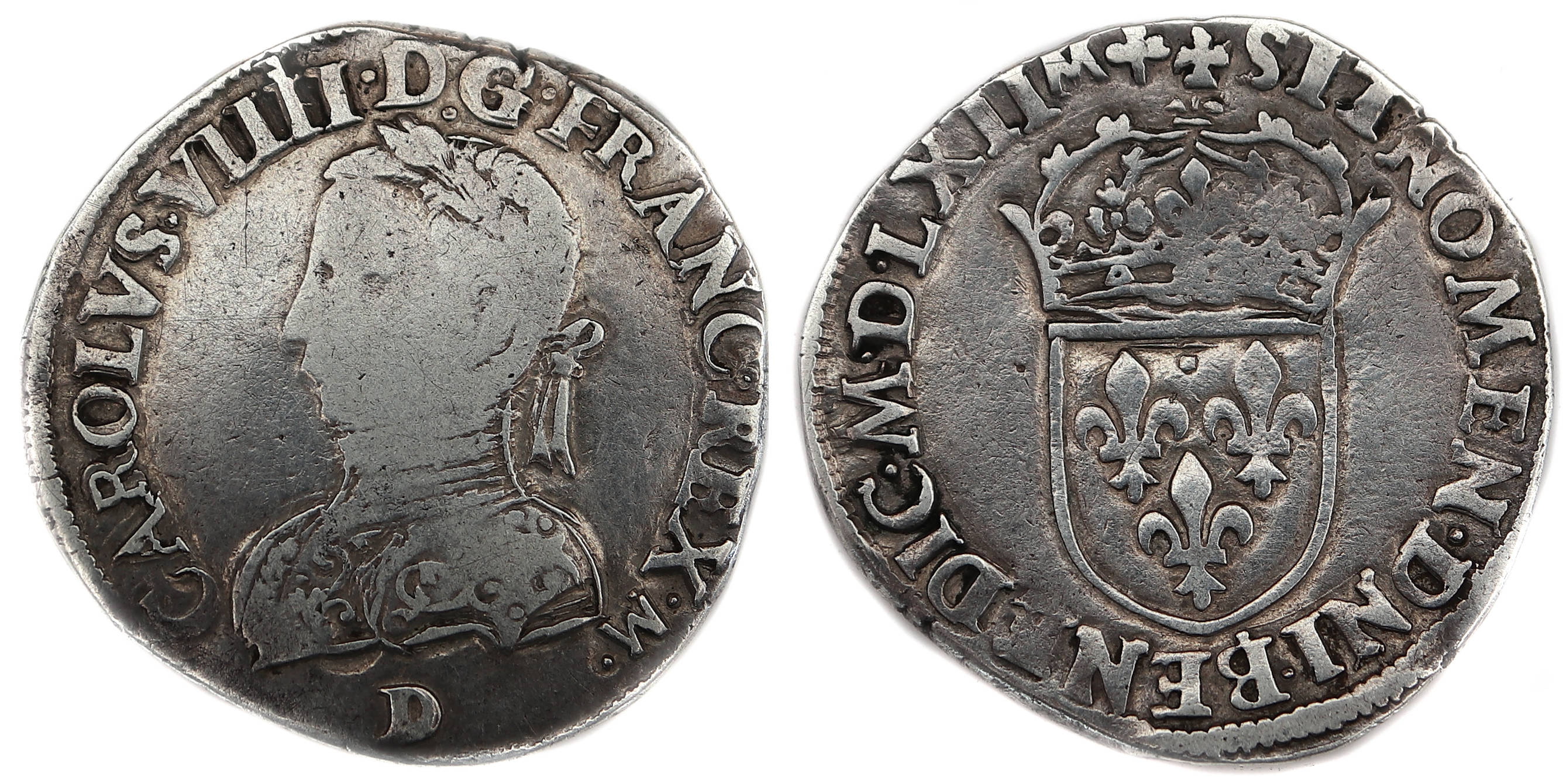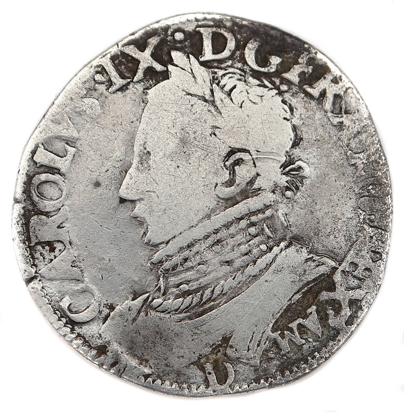 CAROLVS.IX.D.G.FRANC.REX.A.M. D Charles IX par la grâce de Dieu roi des Francs Buste du roi barbu à gauche,