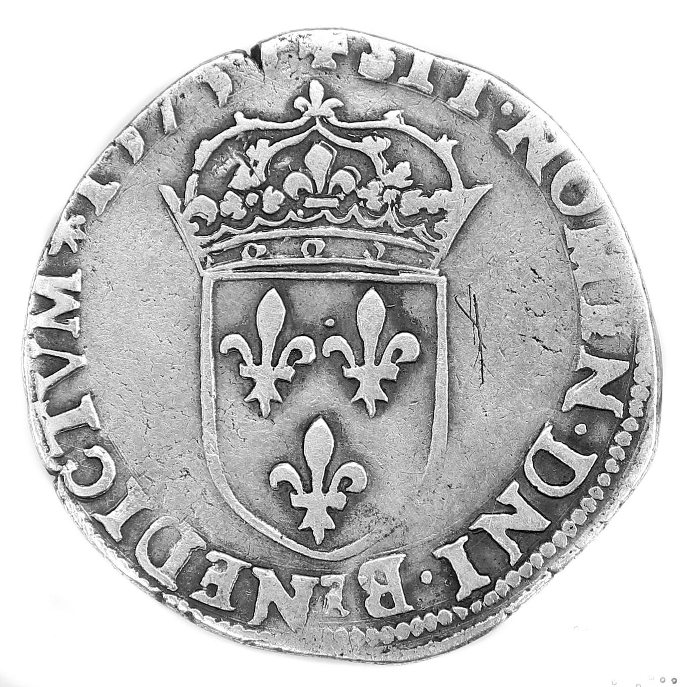 de 2C couronnés et le millésime est en chiffres arabes. Belle monnaie tréflée au droit et une faiblesse de frappe sur l'écu au revers. Poids léger pour ce teston. Axe des coins : 6 h. Voir autre exemplaire. |