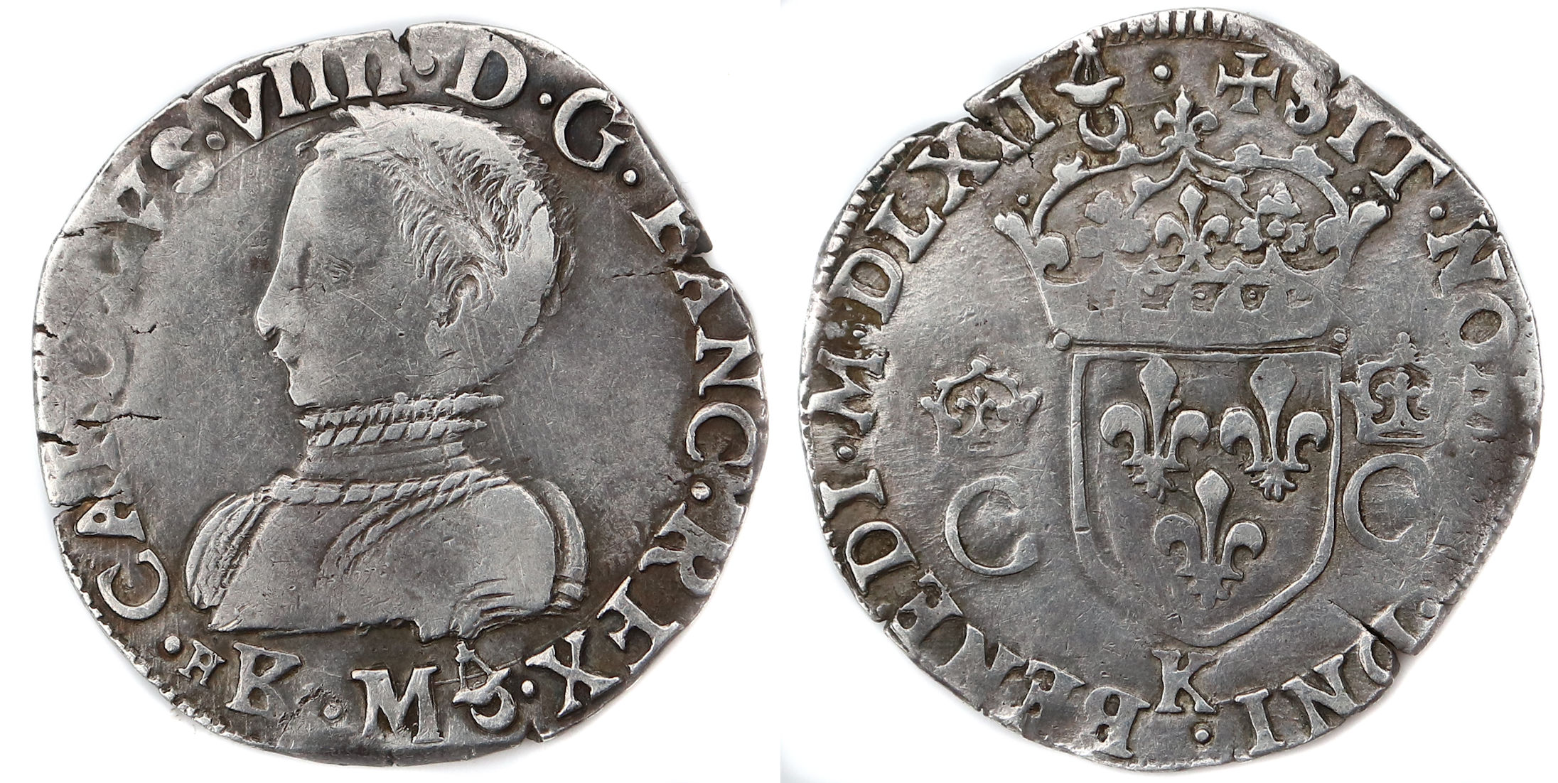 Lettre d'atelier : M(au droit sous le buste) Point secret : 5éme (au droit) Millésime : MDLXV Chiffre de frappe connu : 214 353 ex. (avec 1/2 testons) |