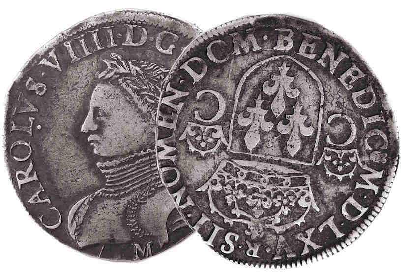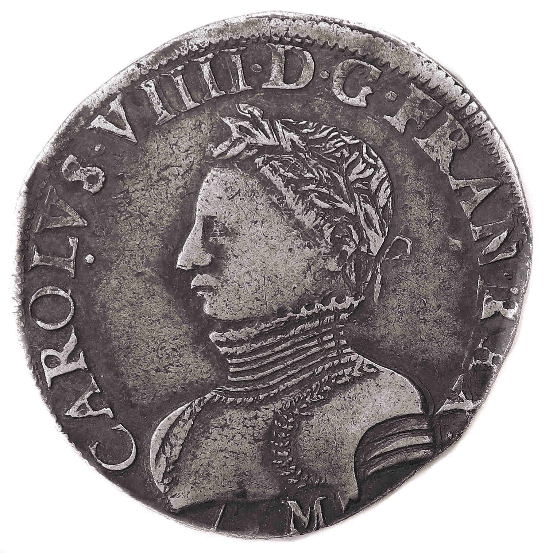 CAROLVS.VIII.D.G.FRAN.REX. K Charles VIIII par la grâce de Dieu roi des Francs Buste du roi, à droite, cuirassé