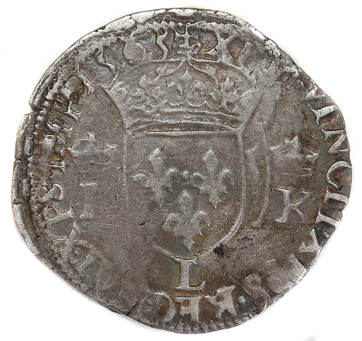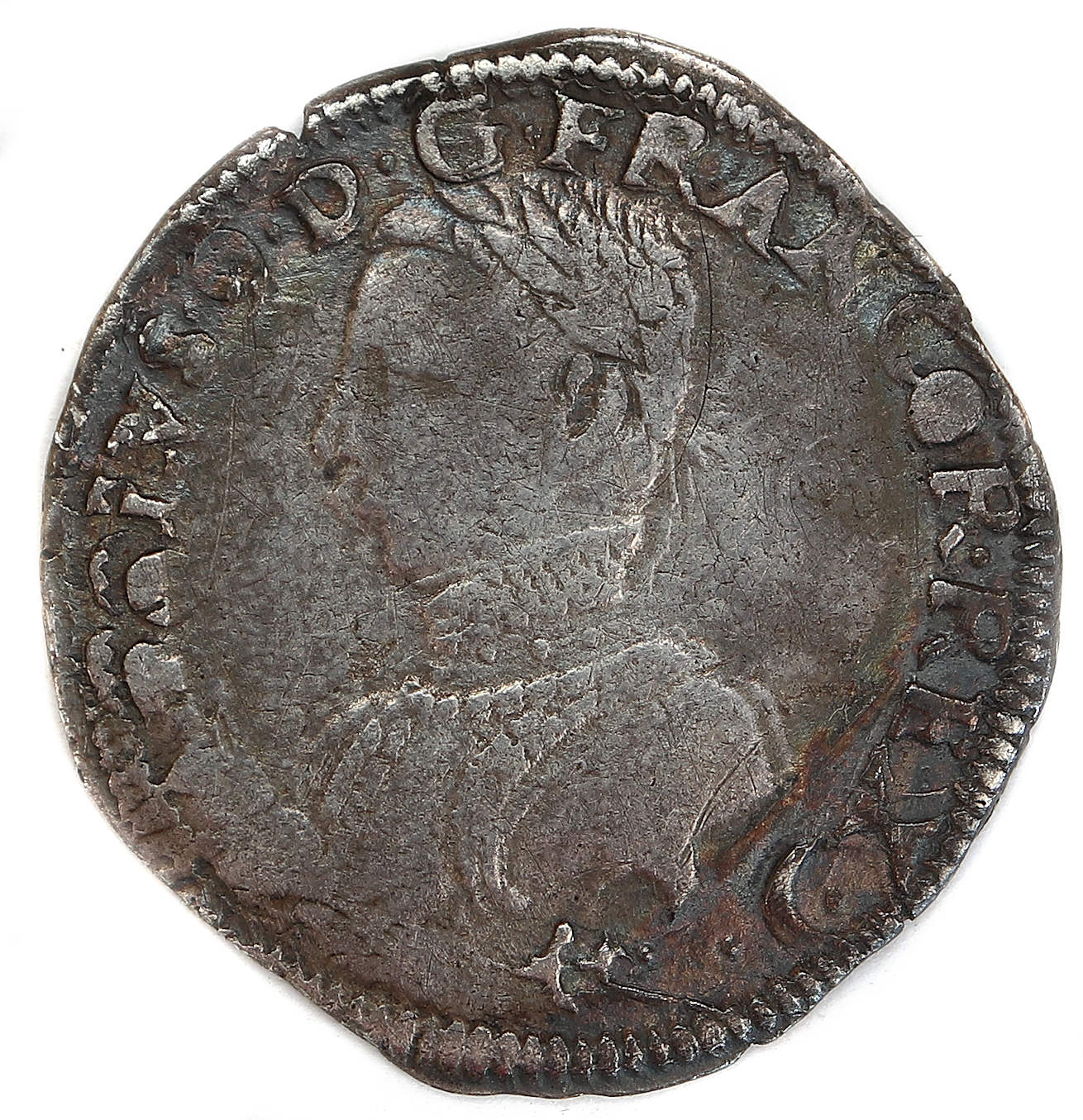.KAROLVS.9..D.G.FRANCOR.REX(dif)ancre Charles IX par la grâce de Dieu roi des Francs Buste du roi, à droite, cuirassé