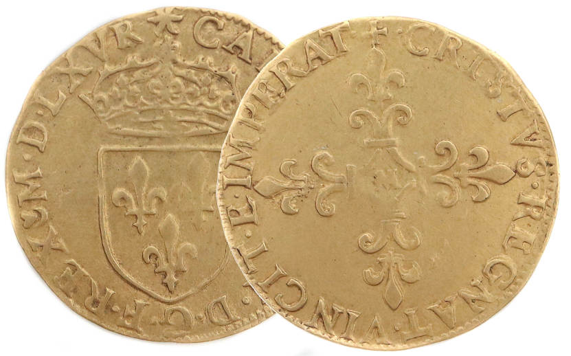 de la croix fleurdelisée) Point secret : 5éme (au revers) Millésime : MDLXV Chiffre de frappe connu : 25 800 ex .(avec demi-ecus d'or Indice de rareté : R2 |