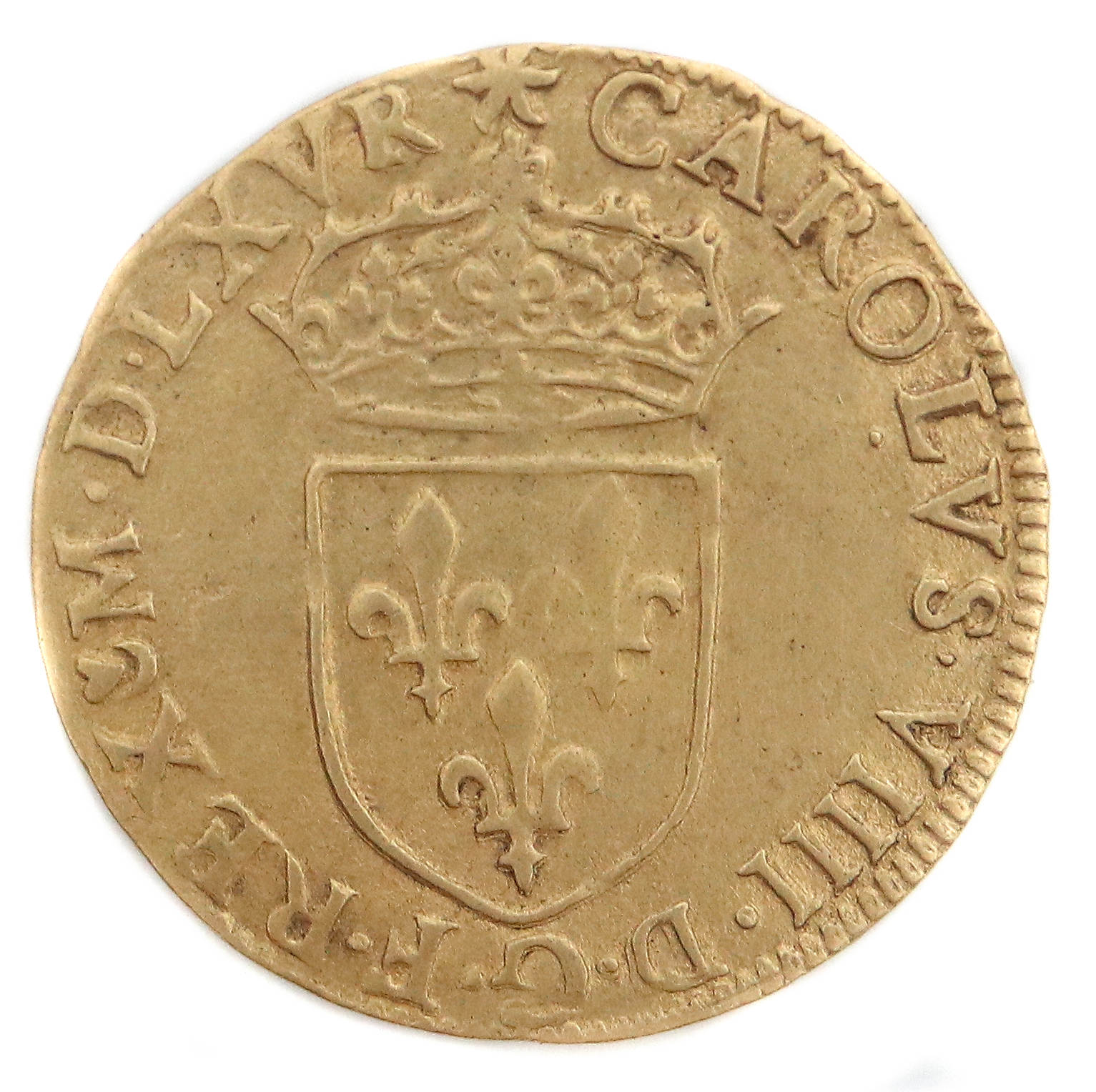 (soleil)CAROLVS.VIIII.D.G.F.REX(dif).M.D.LXV.(dif) Charles VIIII par la grâce de Dieu roi des Francs Ecu de France couronné d'un