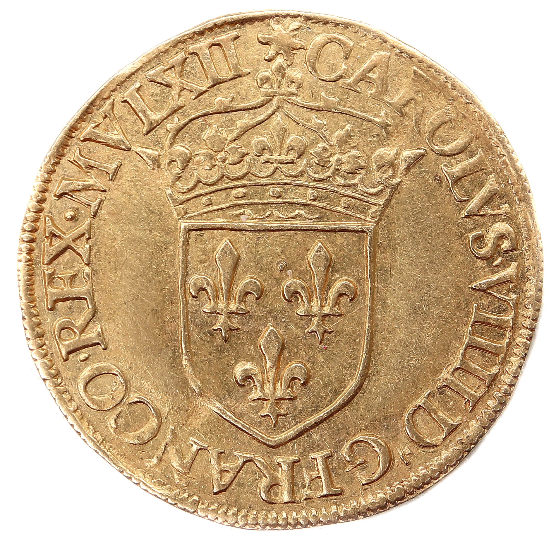 (soleil)CAROLVS.VIIII.D(dif)G.FRANCO..REX.MVLXII Charles VIIII par la grâce de Dieu roi des Francs Ecu de France couronné