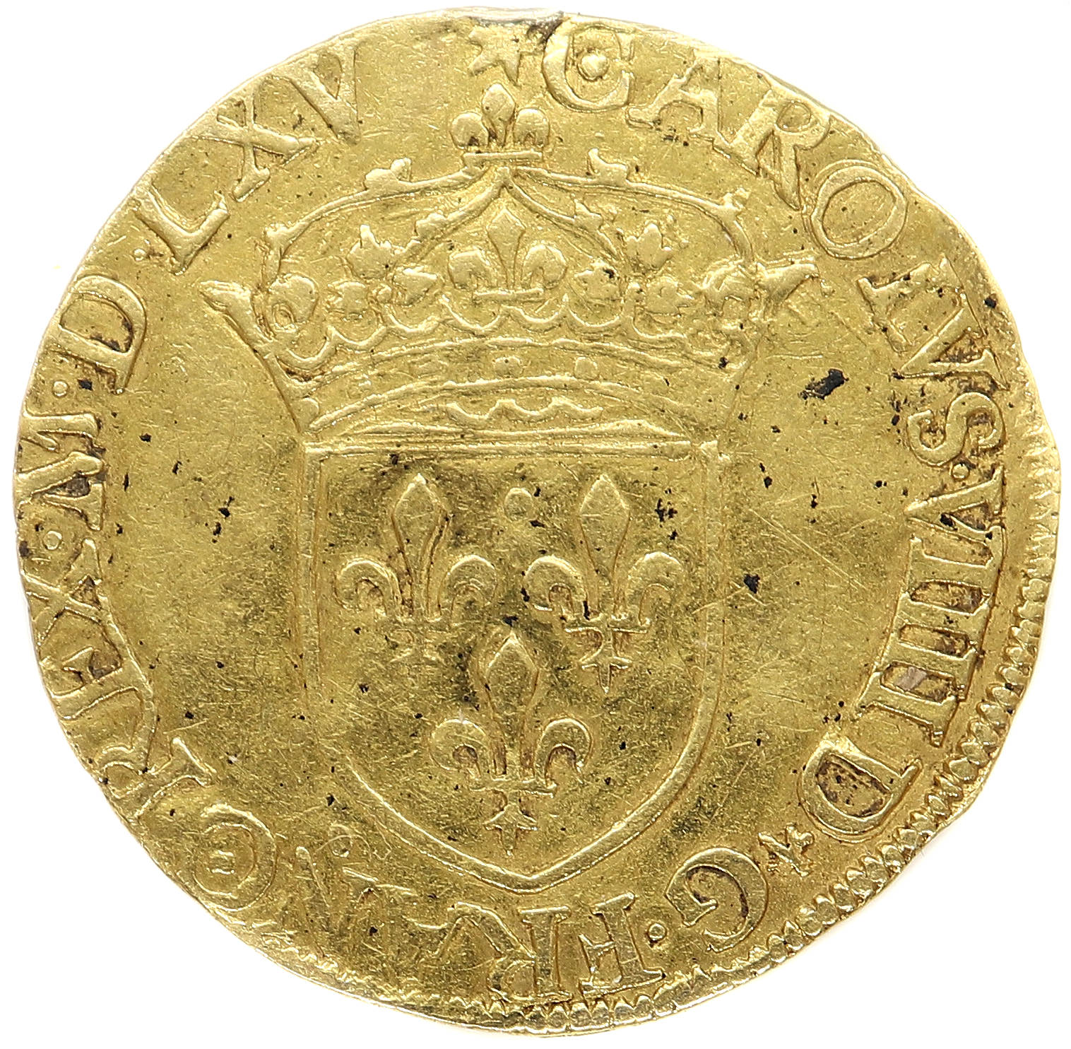 VIIII.D(dif)G.FRANC REX .M.D.LXV Charles VIIII par la grâce de Dieu roi des Francs Ecu de France couronné d'un
