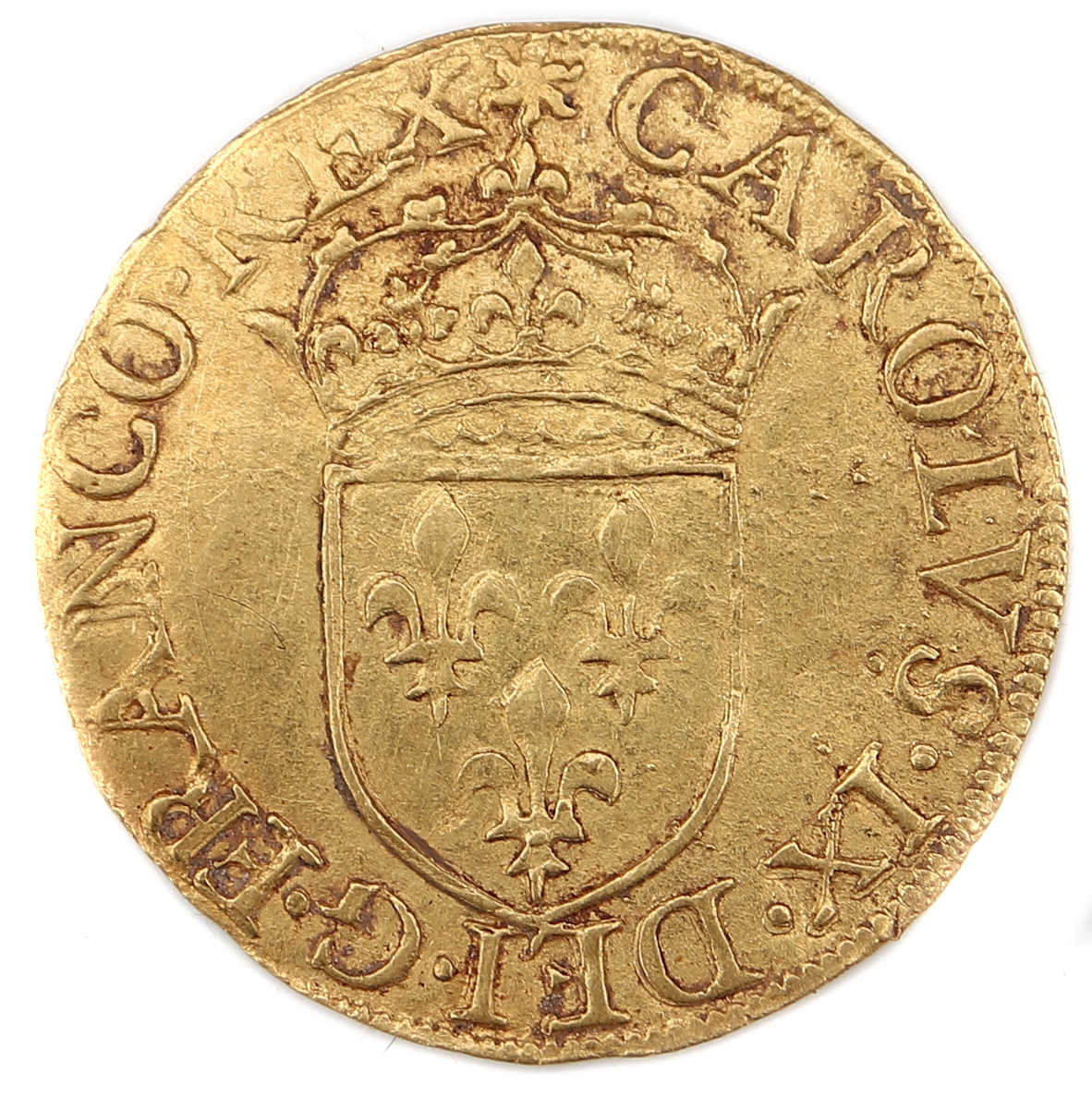 (soleil)CAROLVS.IX.DEI.G.FRANCO.REX Charles VIIII par la grâce de Dieu roi des Francs Ecu de France couronné