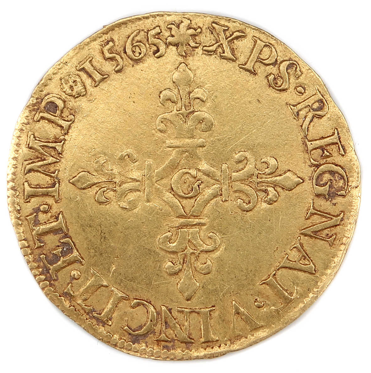 de la croix fleurdelisée) Point secret : 8éme (au droit) Millésime : 1565 Chiffre de frappe connu : 38 010 ex (avec 1/2 Ecus) |