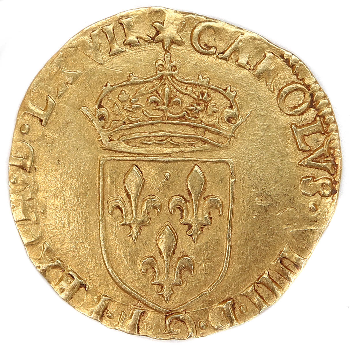 (soleil)CAROLVS.VIIII.D.G.F.RX(dif).M.D.LVI.(dif) Charles VIIII par la grâce de Dieu roi des Francs Ecu de France couronné d'un