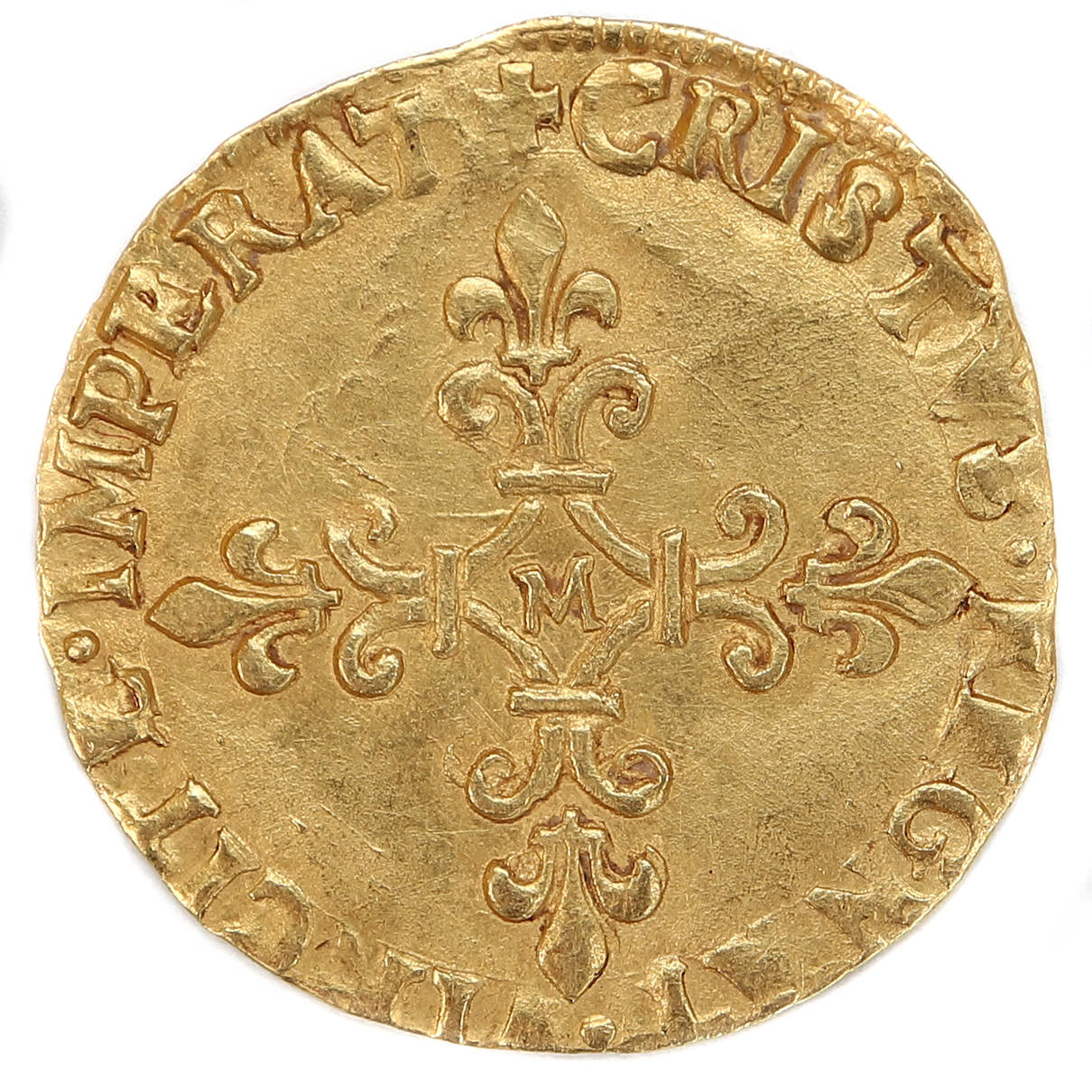 +CRISTVS.REGNAT.VINCIT.E.IMPERAT Christ règne, vainc, commande Croix fleurdelisée avec lettre