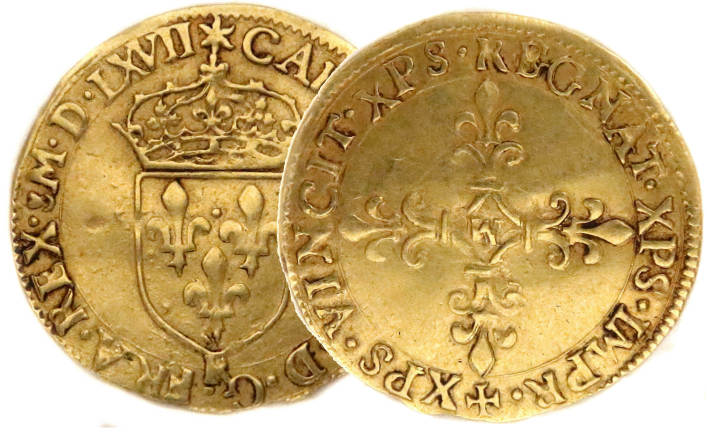 de la croix fleurdelisée) Point secret : 5éme (au droit) Millésime : MDLXVII Chiffre de frappe connu : 21 400 ex .(avec demi-ecus d'or Indice de rareté : R4 |