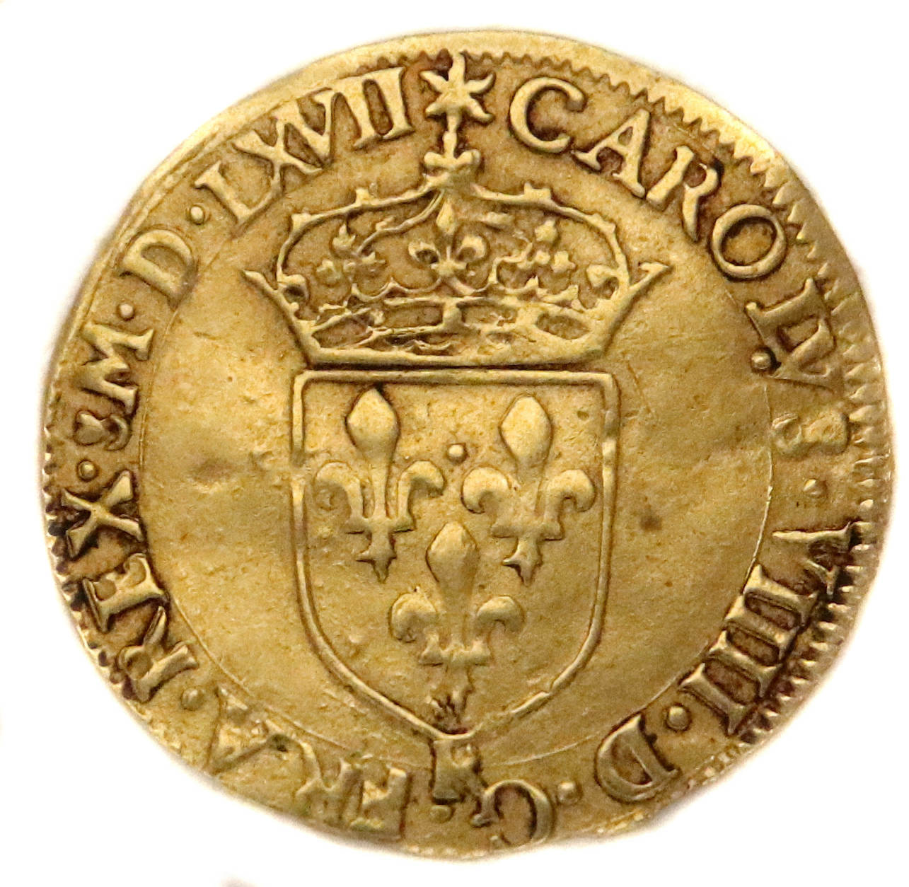 (soleil)CAROLVS.VIIII.D.G.FRA.REX.(dif).M.D.LXVII Charles VIIII par la grâce de Dieu roi des Francs Ecu de France couronné d'un