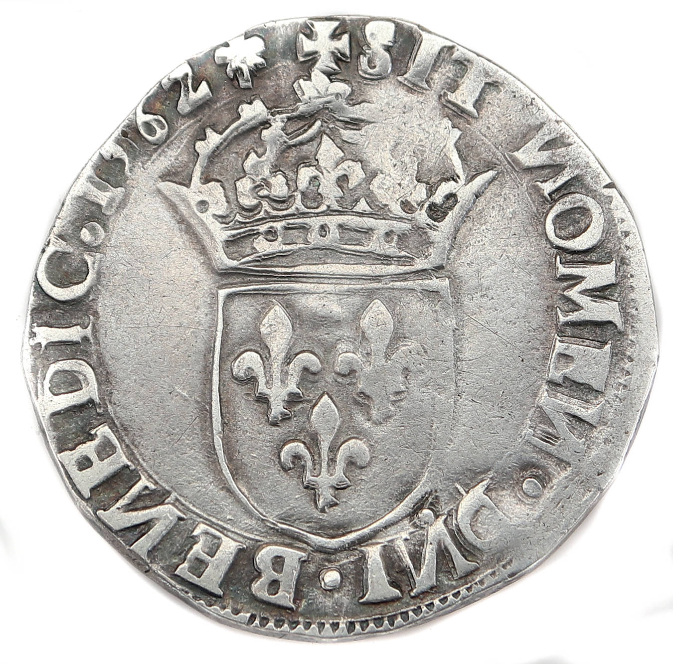 Lettre d'atelier : I (au droit sous le buste) Point secret : 10éme au revers Millésime : 1562 Chiffre de frappe connu : 102 925ex. (avec 1/2 testons) |