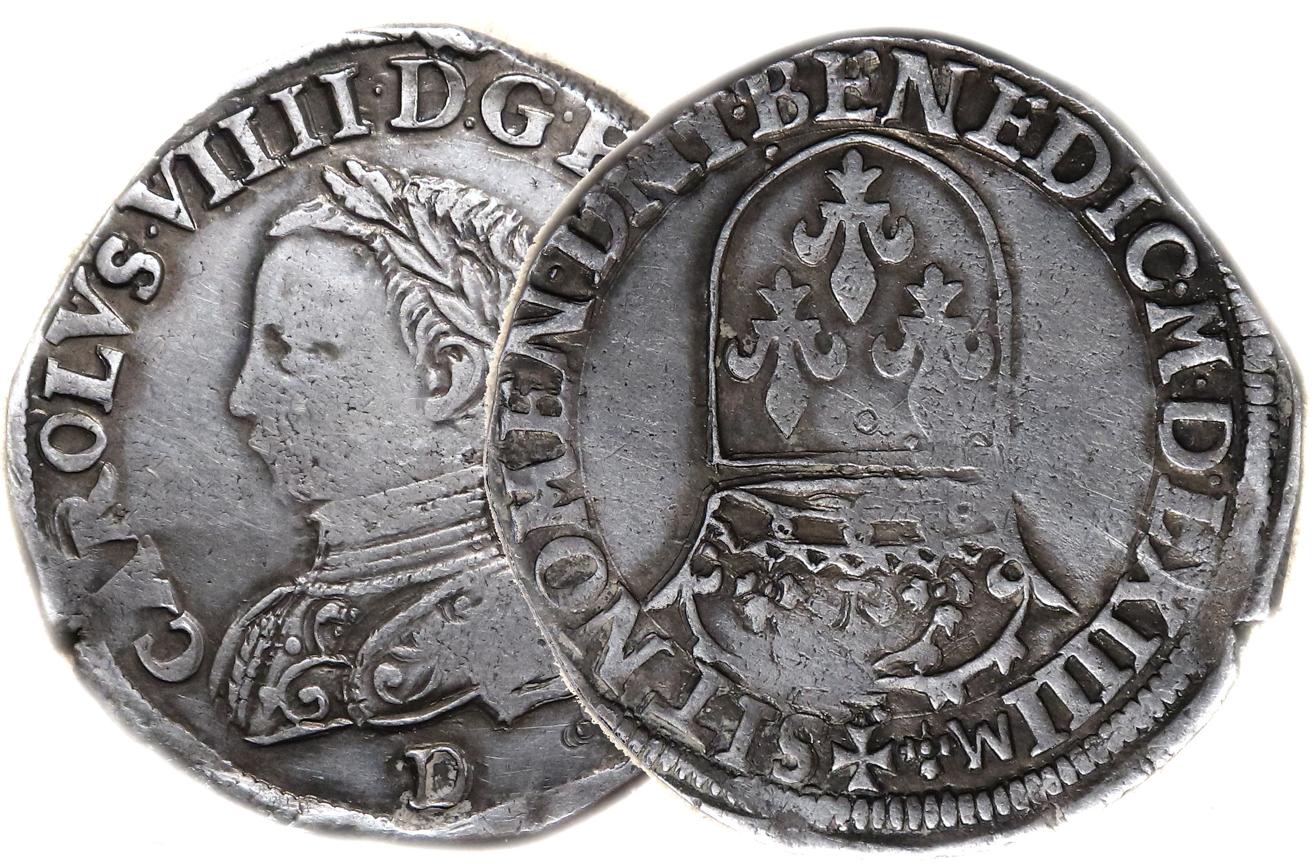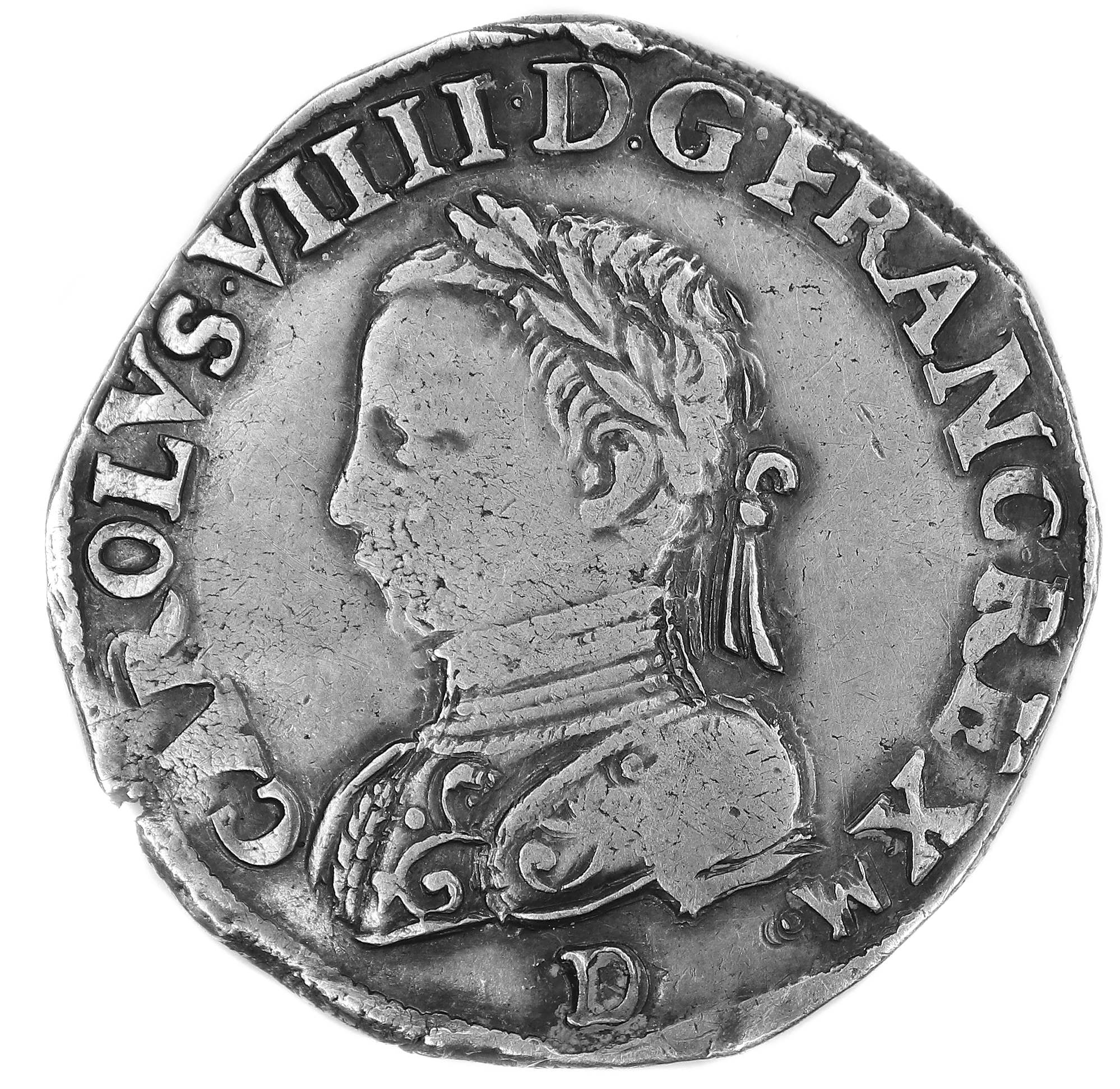 CAROLVS.VIIII.D.G.FRANC.REX.M.(dif) D Charles VIIII par la grâce de Dieu roi des Francs Buste du roi, à droite, cuirassé