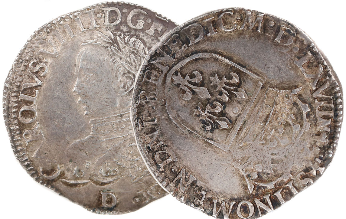 une cuirasse damasquinée et l'écu du revers n'est pas accosté par 2 C. La monnaie présente une patine grise plus marquée au revers.Le flan est irrégulier.L'effigie présente une usuremoins importante que sur nombrede testons de CHARLES IX. Tréflage au revers au niveau de l'écu et d'une partie de la légende. Provenance : Salon de BAGNOLET (décembre 2021). Axe des coins : 4 h. |