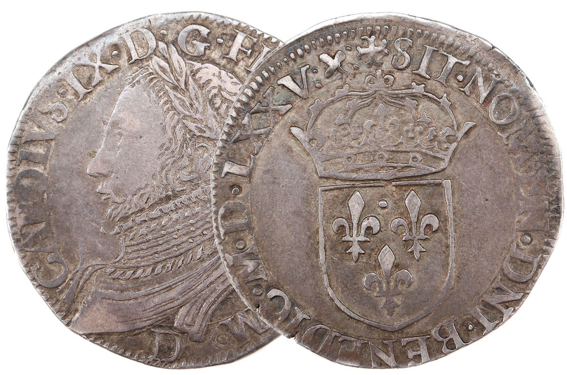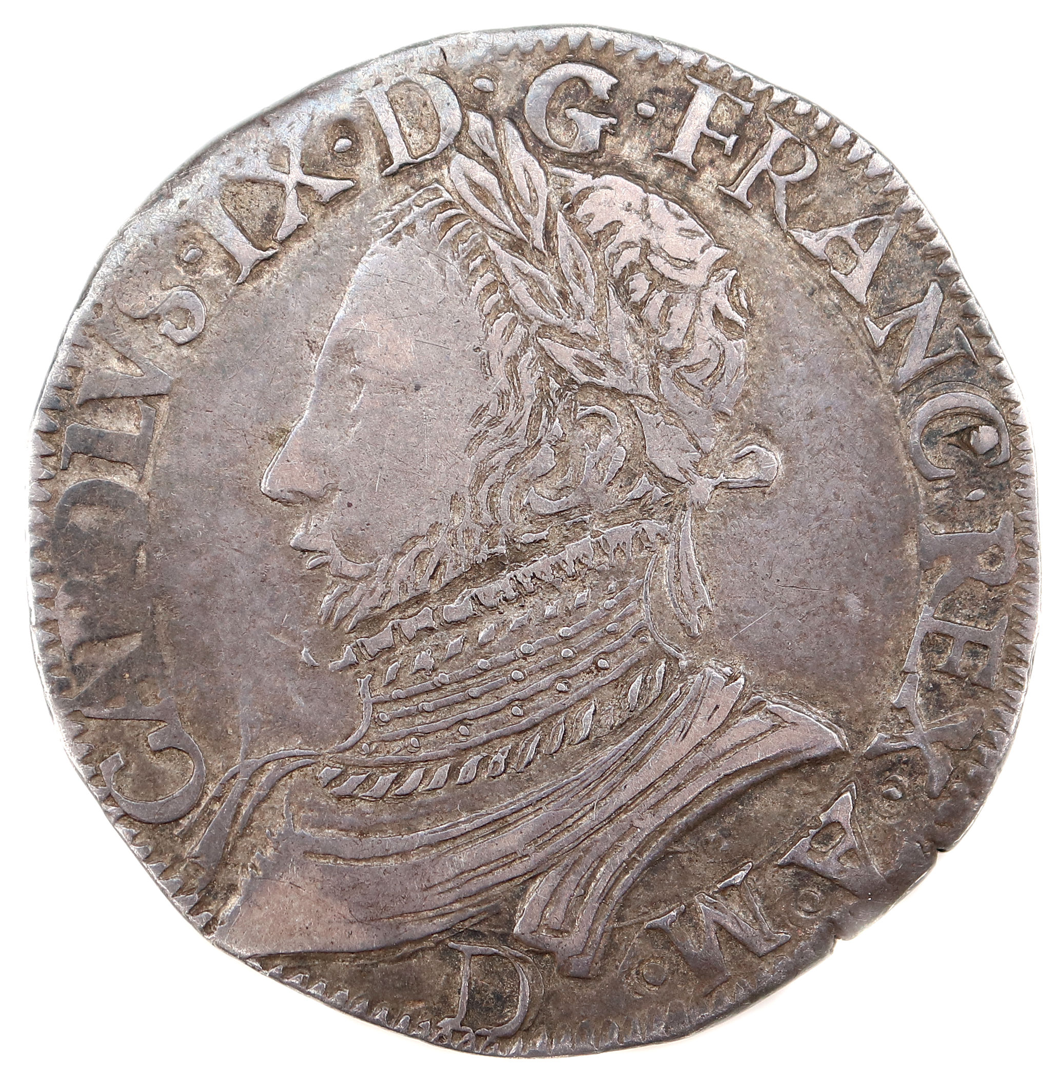 CAROLVS.IX.D.G.FRANC.REX.A.M. D Charles IX par la grâce de Dieu roi des Francs Buste du roi barbu à gauche,