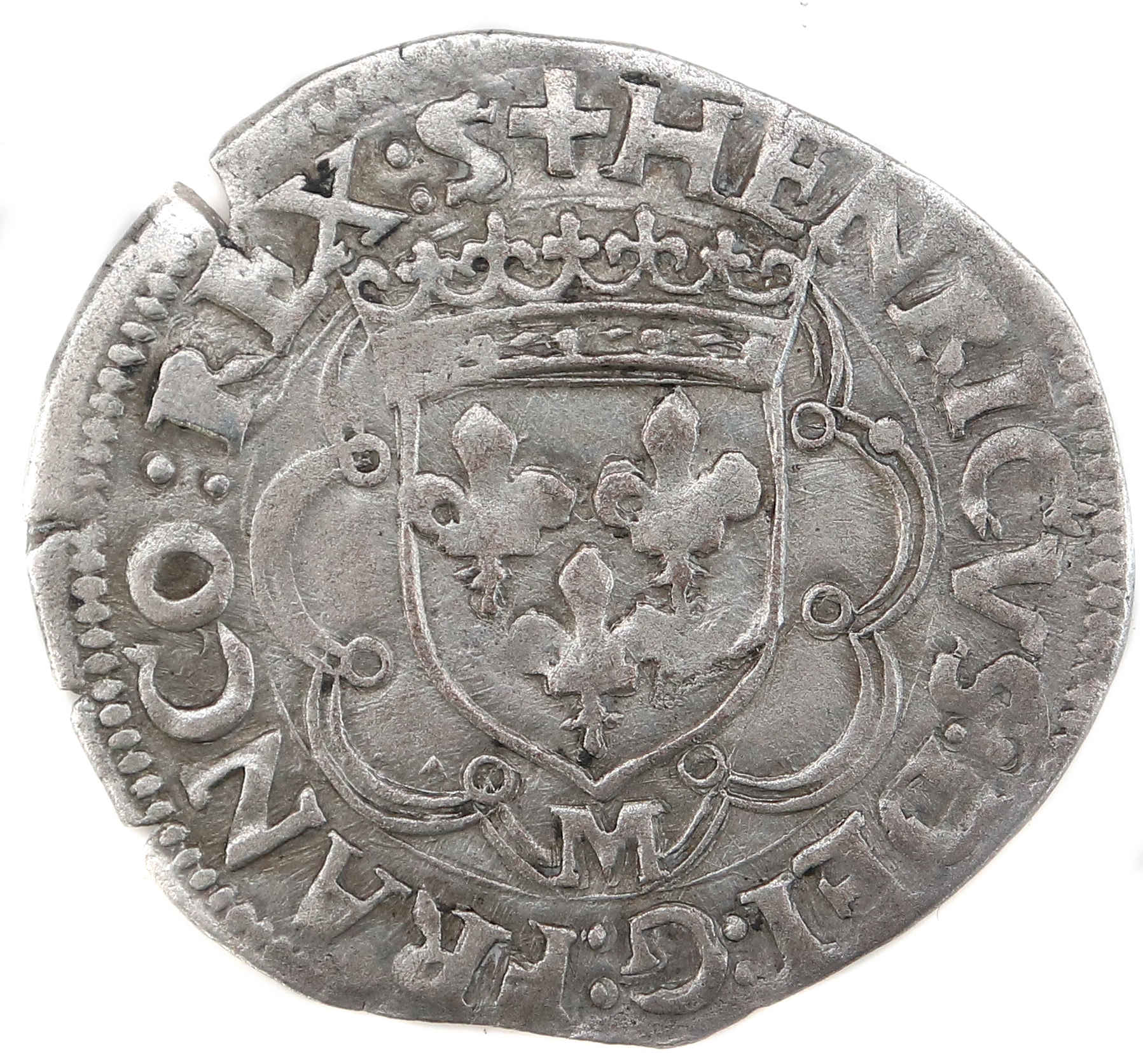 +HENRICVS:.DEI:G:FRANCO:REX.:S Henri par la:grâce de Dieu roi des Francs Ecu de France couronné dans un