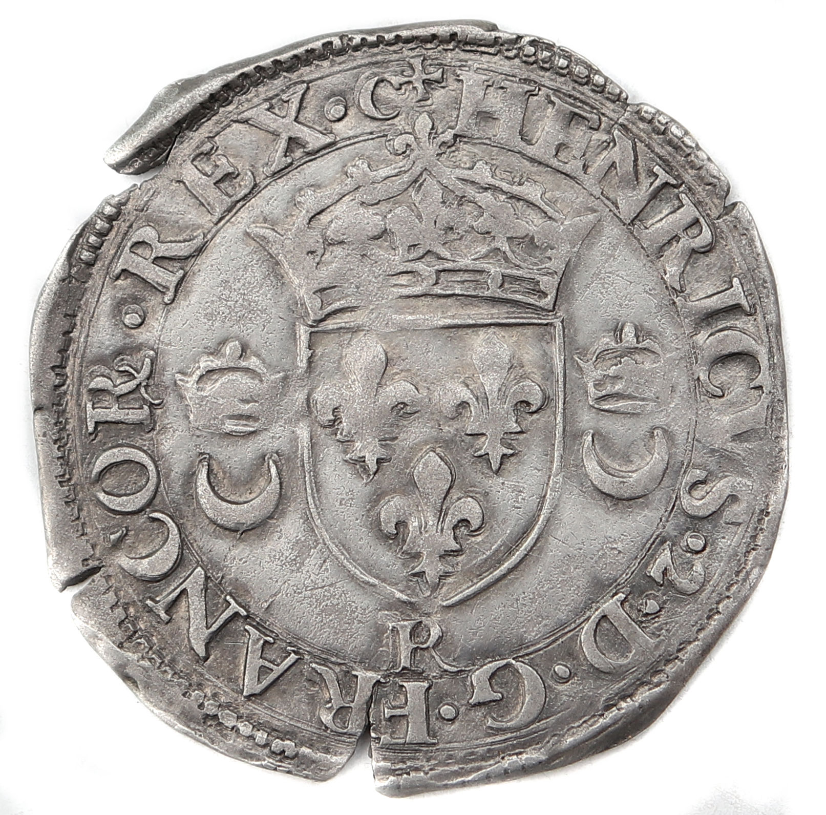 d'une frappe illégale ? Résultat d'une production importante dans les ateliers et en raison de son faible titre, le douzain aux croissants est une monnaie qui se trouve facilement mais plus difficilement en bon état. Le flan de la monnaie présente plusieurs éclatements mais la monnaie est dans un état qui reste agréable avec de beaux reliefs sur la plupart des motifs. . Axe des coins : 6 h |
