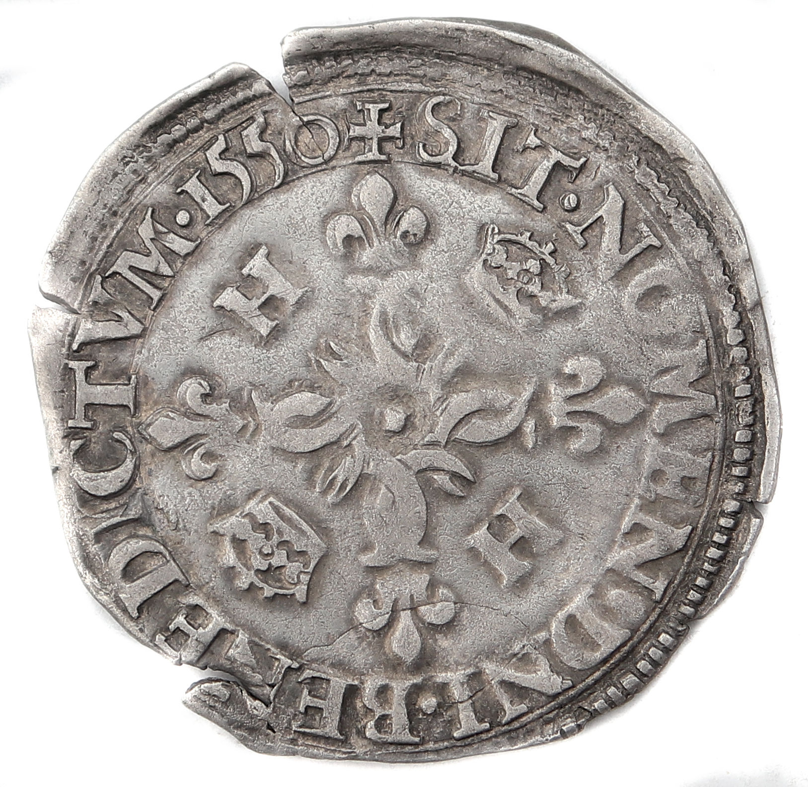 Lettre d'atelier : R (au droit sous l'écu) Point secret : Non Millésime : 1550 Chiffre de frappe connu : 1 045 440 ex (avec 1551) Indice de rareté : R |