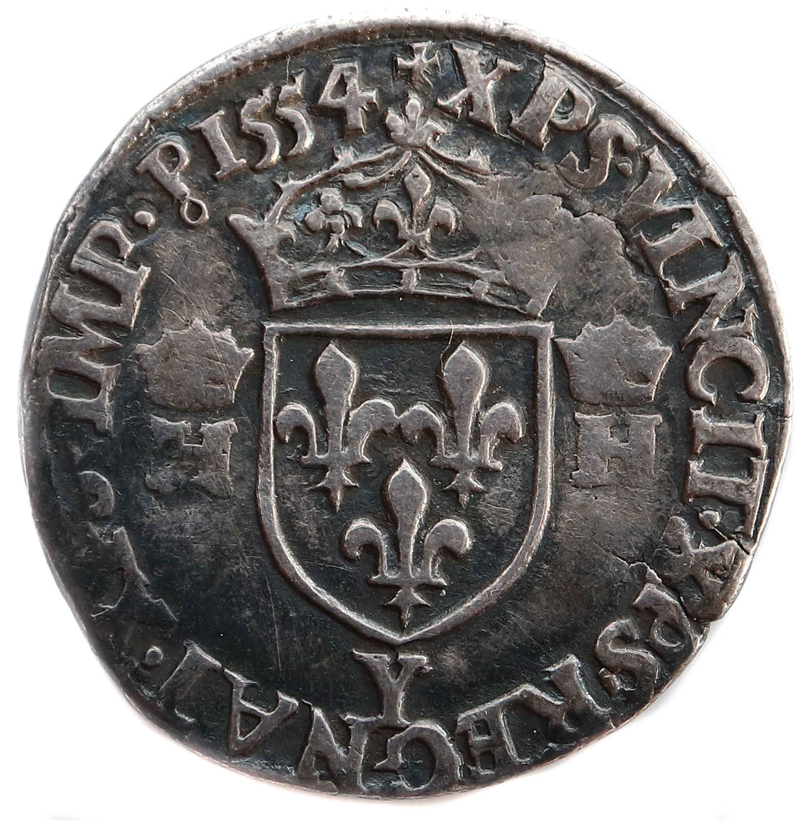 Lettre d'atelier : Y (au revers sous l'écu) Point secret : Non Millésime : 1554 Chiffre de frappe connu : nc Indice de rareté : R5 |