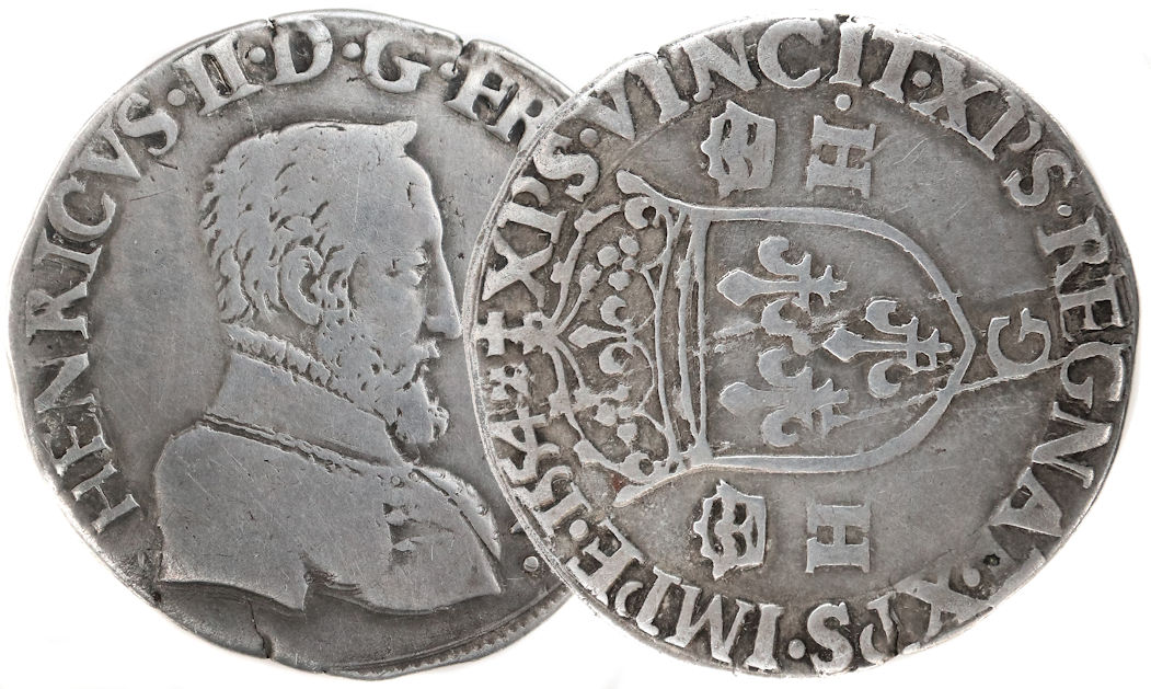 +XPS.VINCIT.XPS.REGNAT.XPS.IMPE.1554(dif) Christ vainc, Chrisr règne. Christ commande. Ecu de France couronné accosté de 2 H couronnées. |