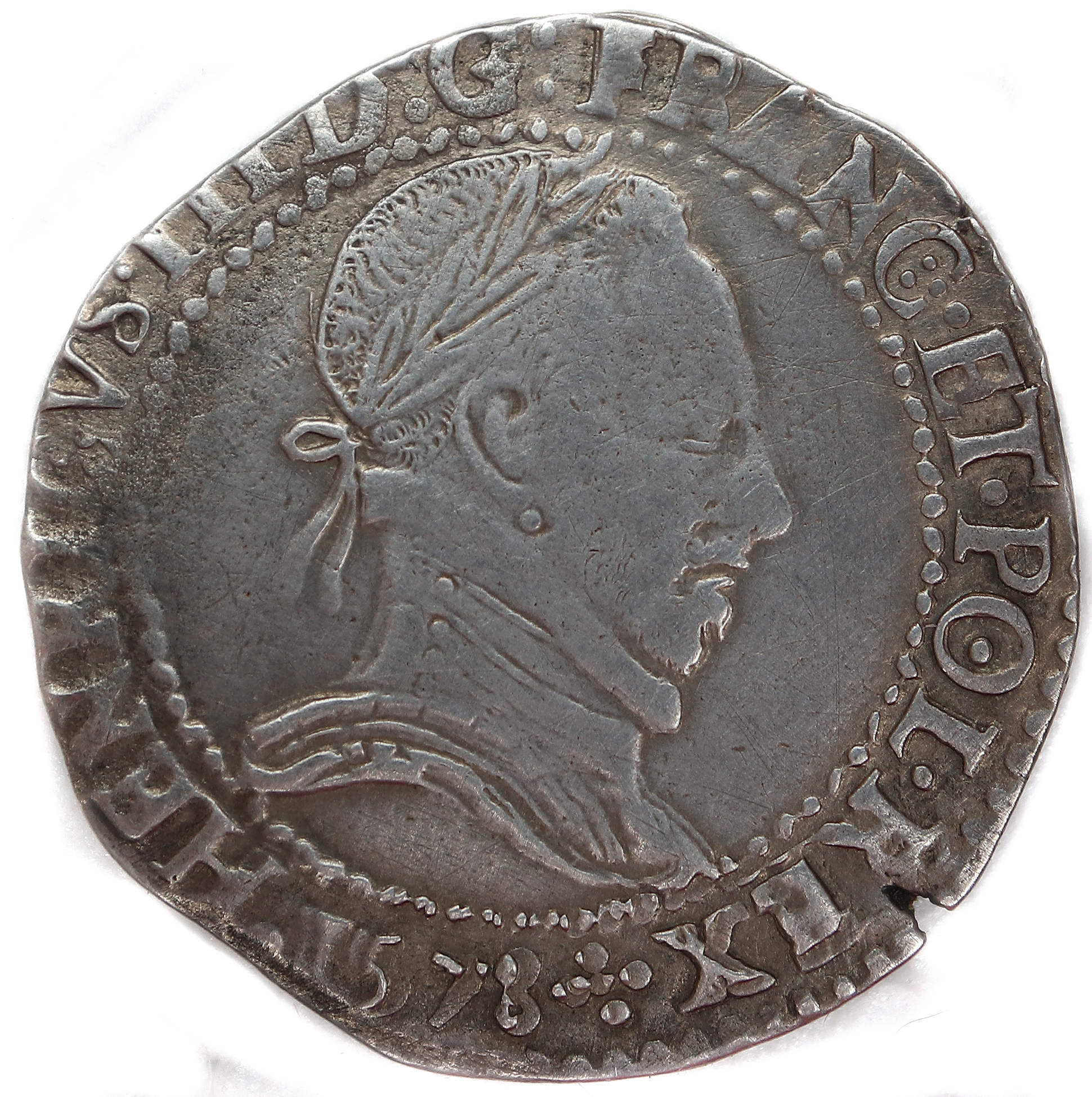 .HENRICVS III.D G.FRANC.ET.POL.REX.(dif)1578 Henri III par la grâce de Dieu roi des Francs et des Polonais Buste lauré et cuirassé, au col