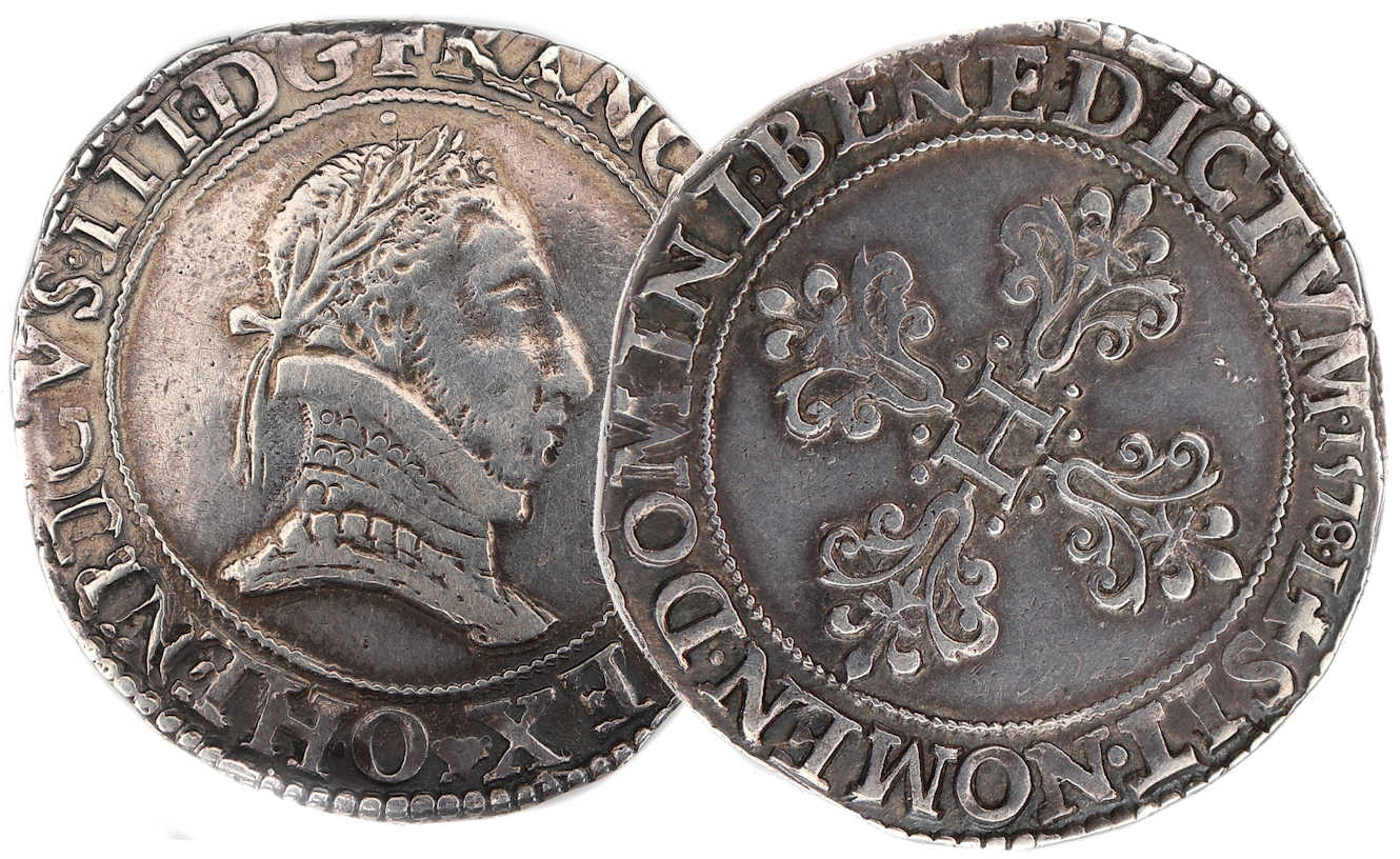 Lettre d'atelier : O (dans la légende, au droit sous l'effigie) Point secret : NON Millésime : 1578 Chiffre de frappe connu : 117 162 ex (avec 1/2 et 1/4 francs)