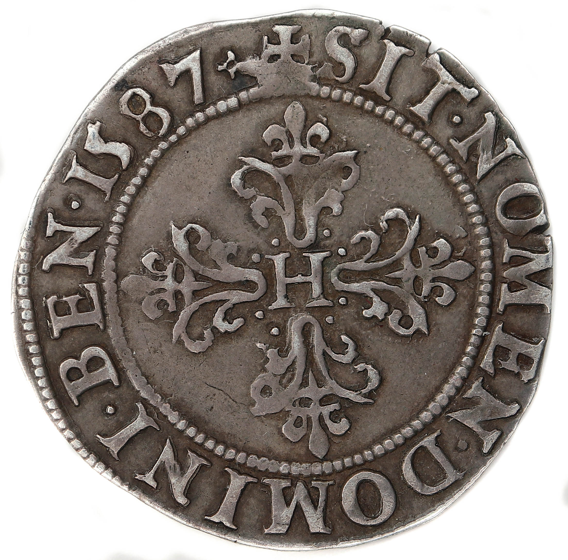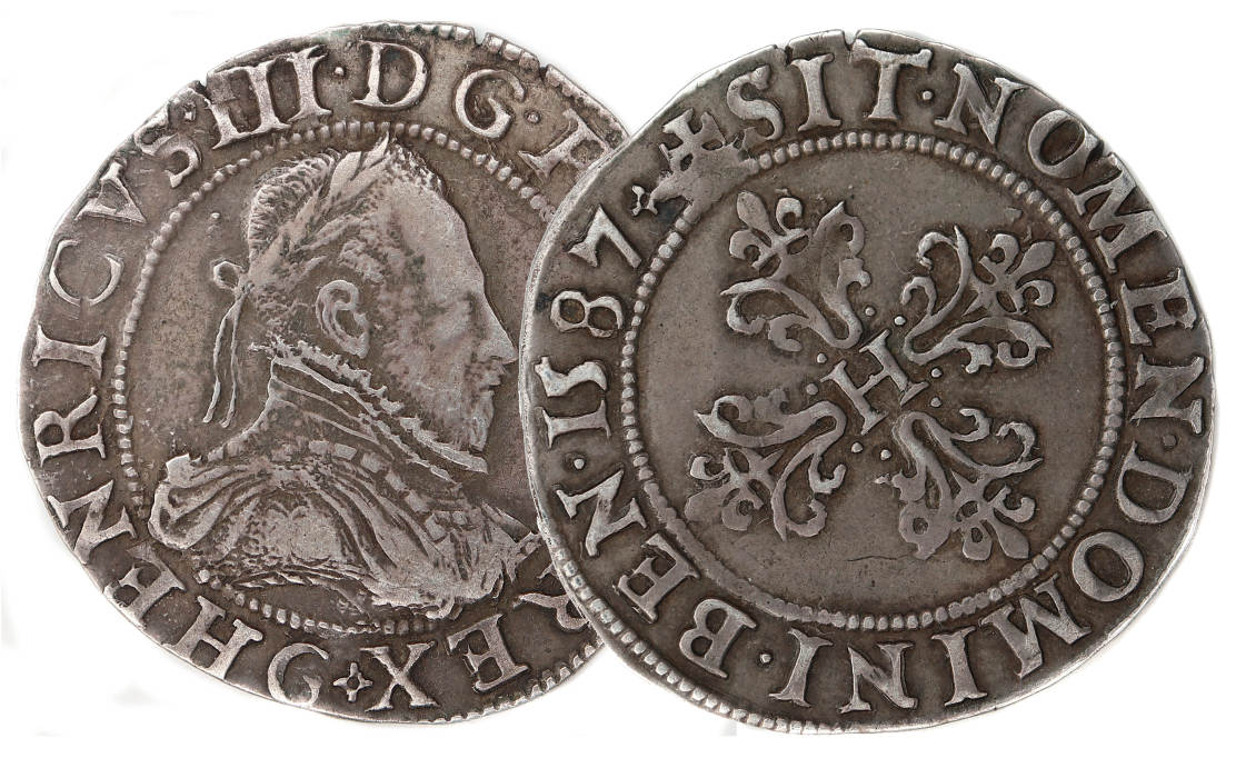 droit dans la légende sous le buste) Point secret : 8éme (au droit) Millésime : 1587 Chiffre de frappe connu : 180 884 ex (avec 1/2 francs) Indice de rareté : R3 |