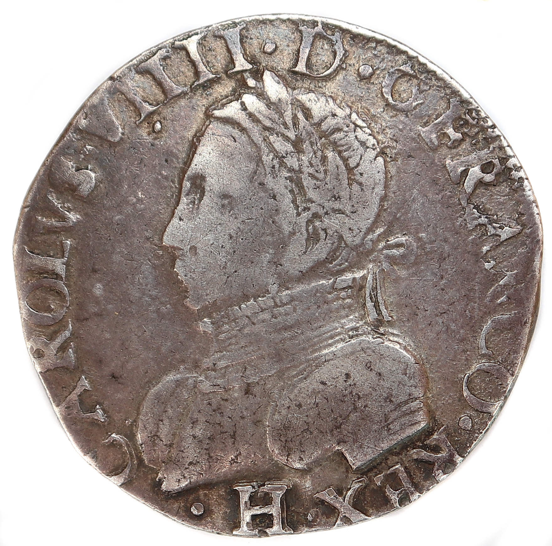 .CAROLVS.VIIII.D.G.FRANCO.REX. H Charles VIIII par la grâce de Dieu roi des Francs Buste du roi, à droite, cuirassé et tête nue