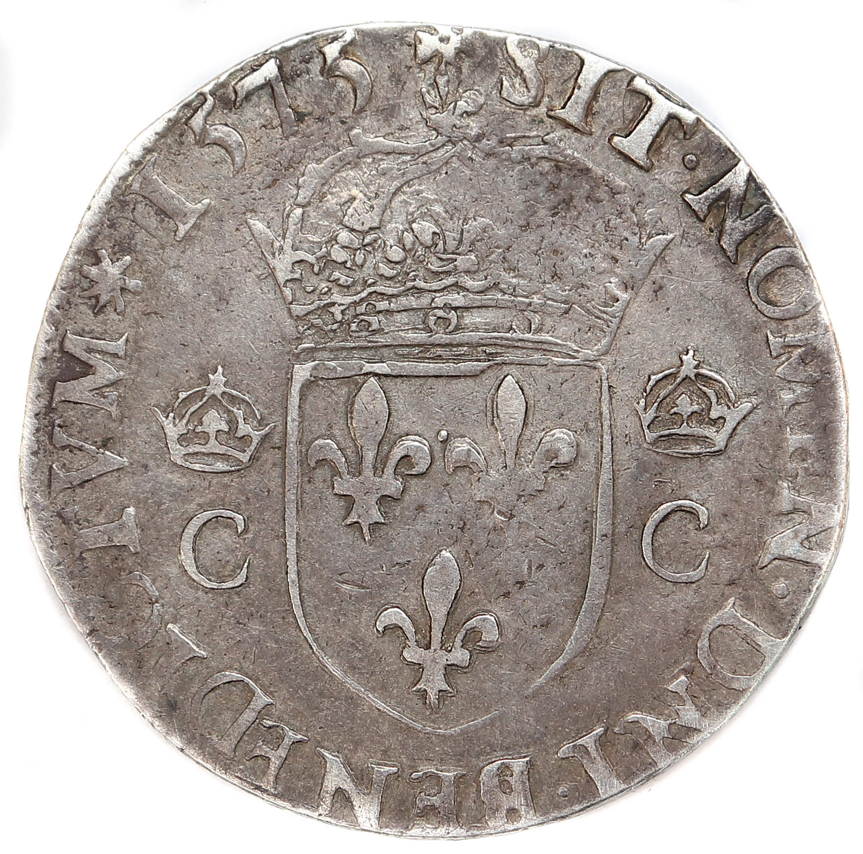 +.SIT.NOMEN.DNI.BENEDICTVM(dif)1575 Béni soit le nom du Seigneur Ecu de France couronné accosté de 2 C couronnés |
