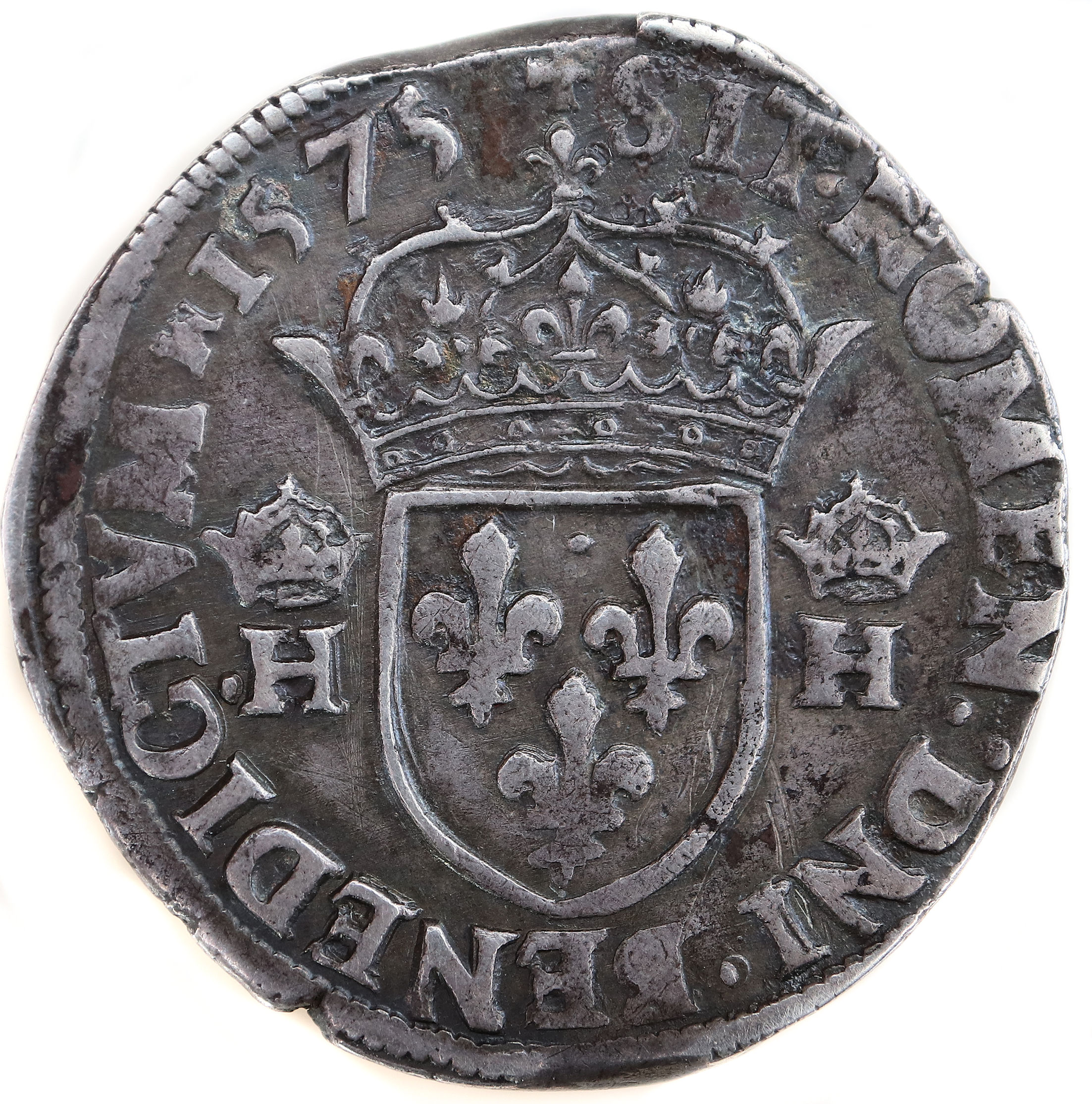 Lettre d'atelier : A (au droit sous l'effigie) Point secret : 18 éme (au droit et au revers) Millésime : 1575 Chiffre de frappe connu : 440 284 ex (avec 1/2 teston) |