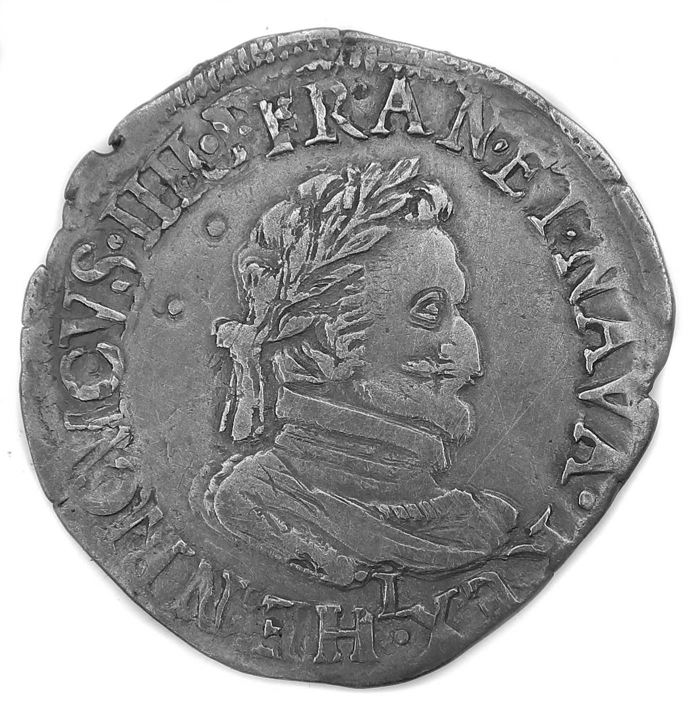 .HENRICVCVS. IIII.D.G.FRAN.ET.NAVA.REX Henri IIIIpar la grâce de Dieu roi de France et de Navarre. Buste du roi à la tête laurée et à la cuirasse